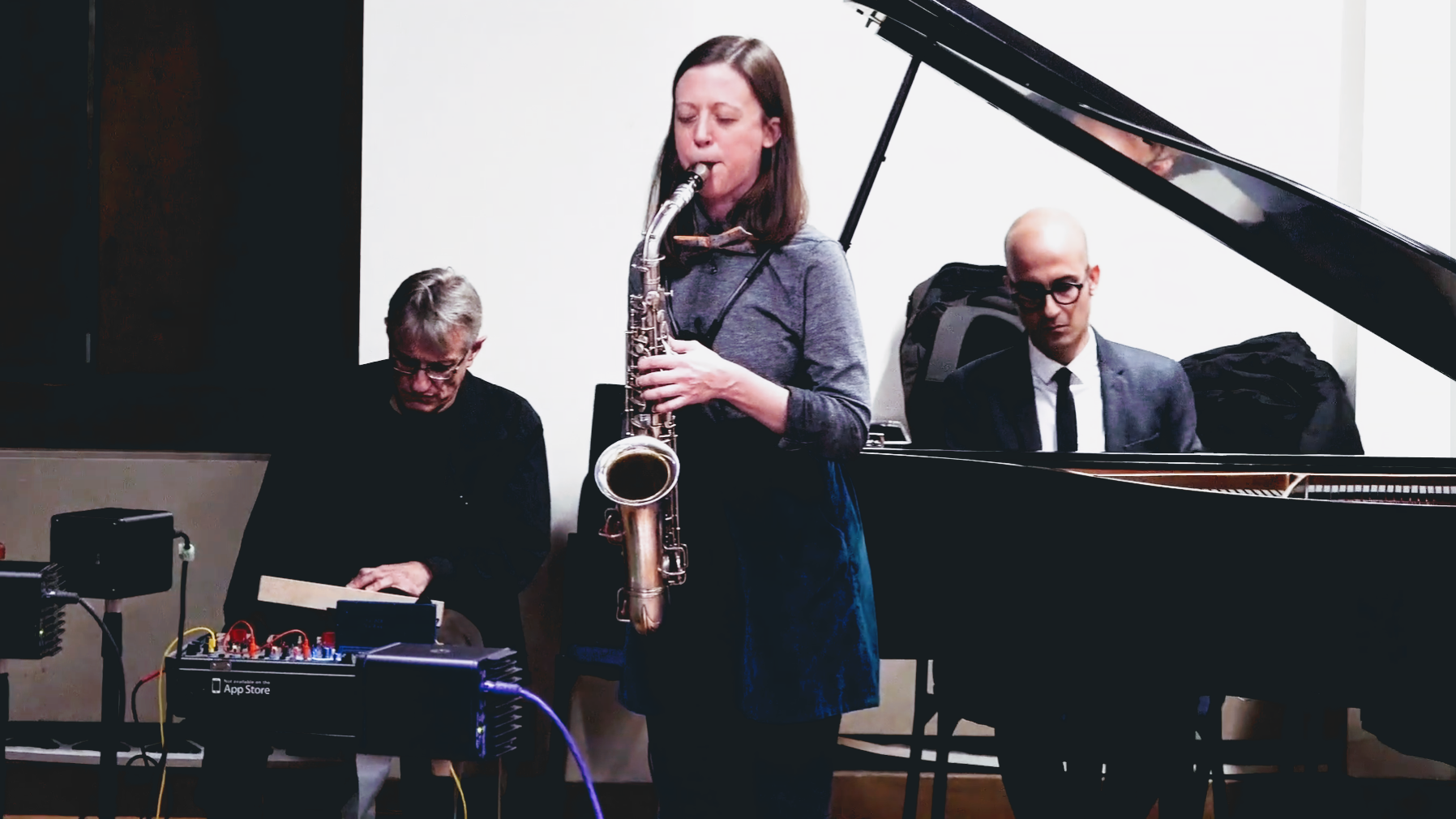 '19. Samadi, Saman. Aži Trio. Concert. “Dark Circuits Bunker Orchestra & Friends.” Organized by Hans Tammen. Saman Samadi, founder, leader, & pianist; Sarah Manning, saxophonist; Hans Tammen, buchla player. New York University, Waverly Building, New York, December 6, 2019.