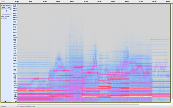 Once the music at the beginning of “Kailasha” has reached its full volume and has continued a few moments, it becomes apparent that this opening sound is not just a single, complex tone, but is comprised of at least two parts: a subtly oscillating sound pitched around D♭3, accompanied by a lower one pulsing at a slower rate an octave below. In fact, the slow pulse of the lower sound is actually a pair of alternating tones with periods of approximately two and three seconds, respectively. The higher sound, by contrast, is more like a tremolo, with a cycle approximately one second long. The interaction of these repeating cycles generates sonic patterns that continuously vary. Such oscillations are clearly present throughout the piece; they provide a pulse that manages to propel the music in lieu of any harmonic progression.[8] At 2:56 a higher pitched resonance emerges, not as a separate tone exactly, but rather as the highlighting of a particular harmonic frequency. Such highlighted harmonics become increasingly prevalent as the piece continues, eventually coalescing into small melodic fragments.
