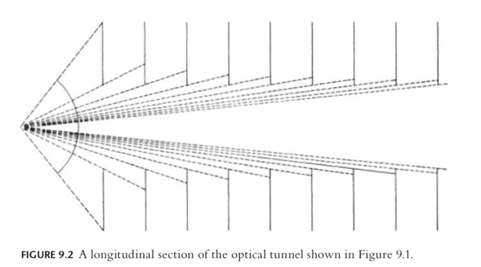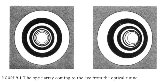Gibson observed this phenomenon in one of his vision experiments. He found that a series of alternating discs, when sufficiently dense, coalesced to form a continuous surface. He showed subjects a series of thin, plastic panels, each with a cut-out circle. The panels were placed one behind the other, alternating black and white, with the diameters of the circles becoming progressively smaller as the series continued away from the viewer. (Figure 2.) When viewing thirty-six panels aligned at equal distances, the alternating black and white circles outlined by the panels coalesced into a smooth surface, forming what looked like a striped tunnel. When there were substantially fewer of these of panels, no more than a dozen or so, most subjects saw individual rings – with “air” in between them (1986: 155).