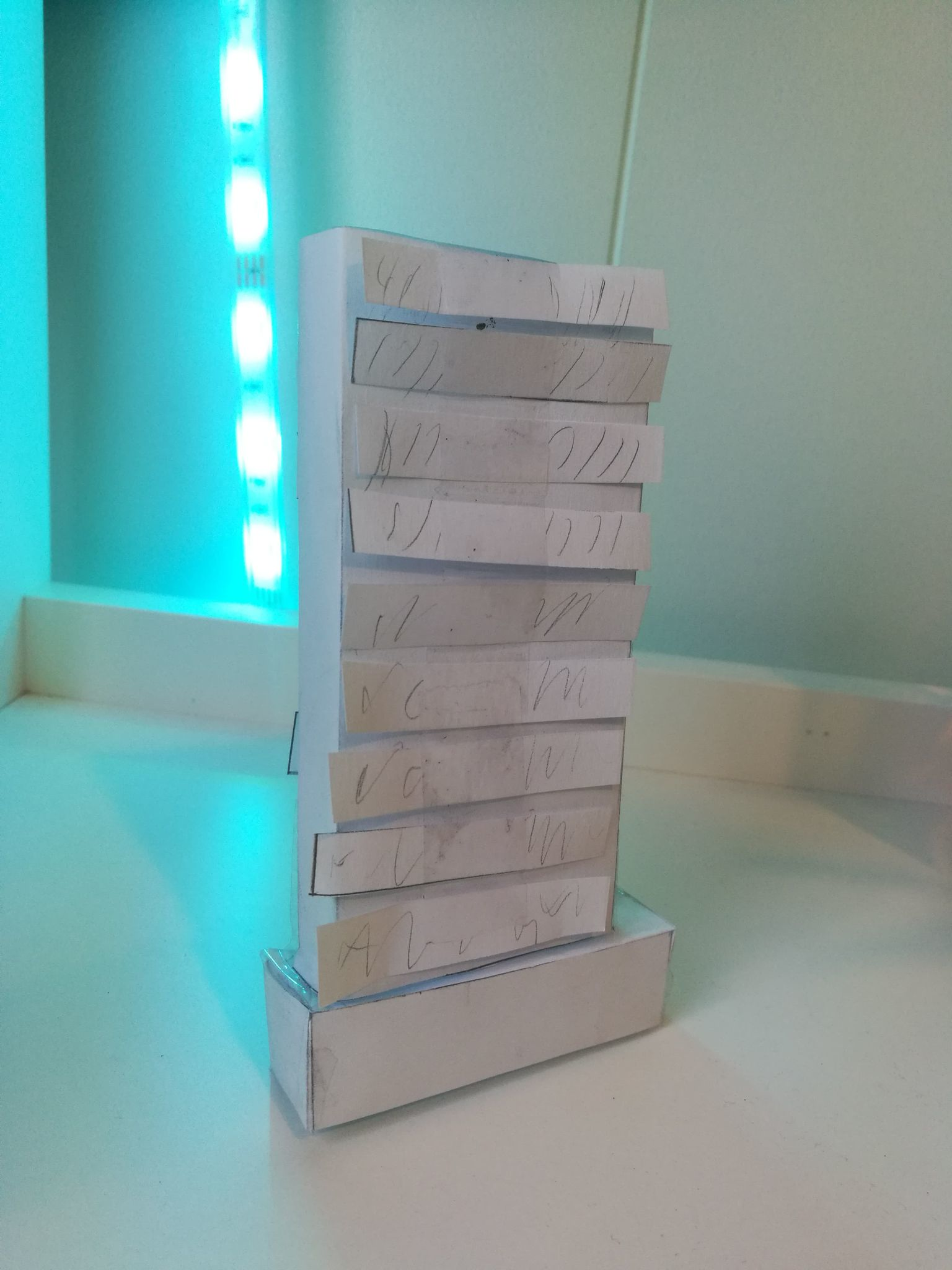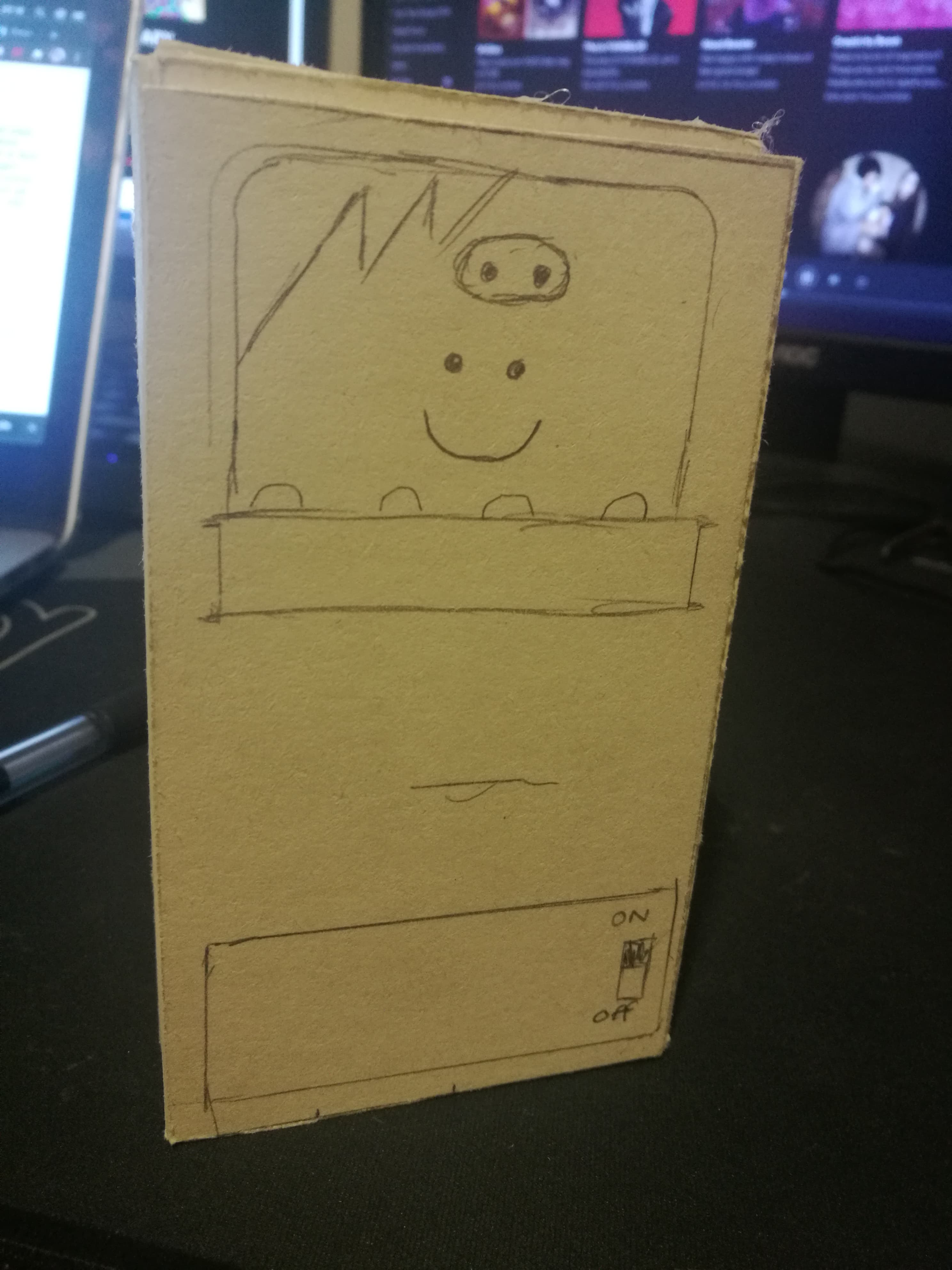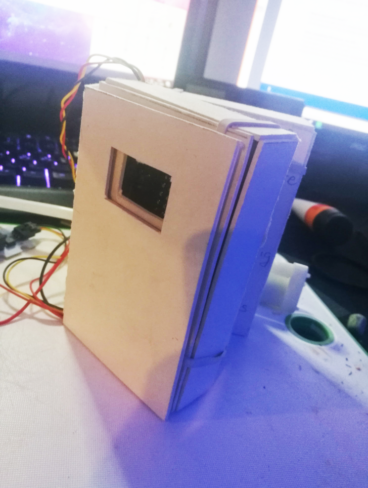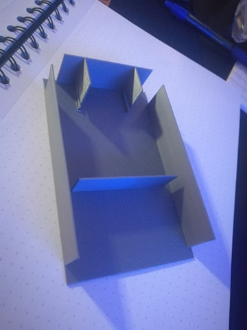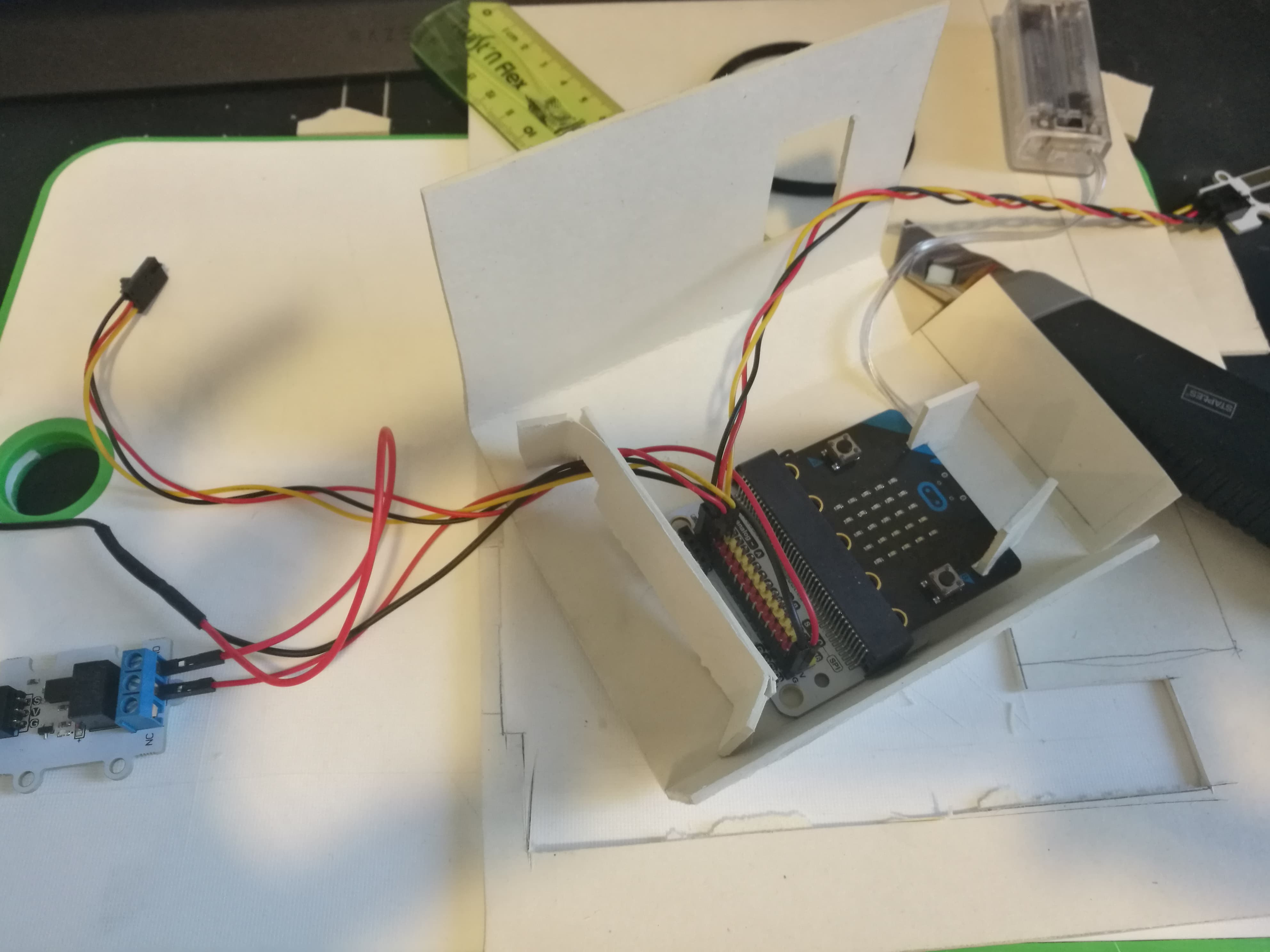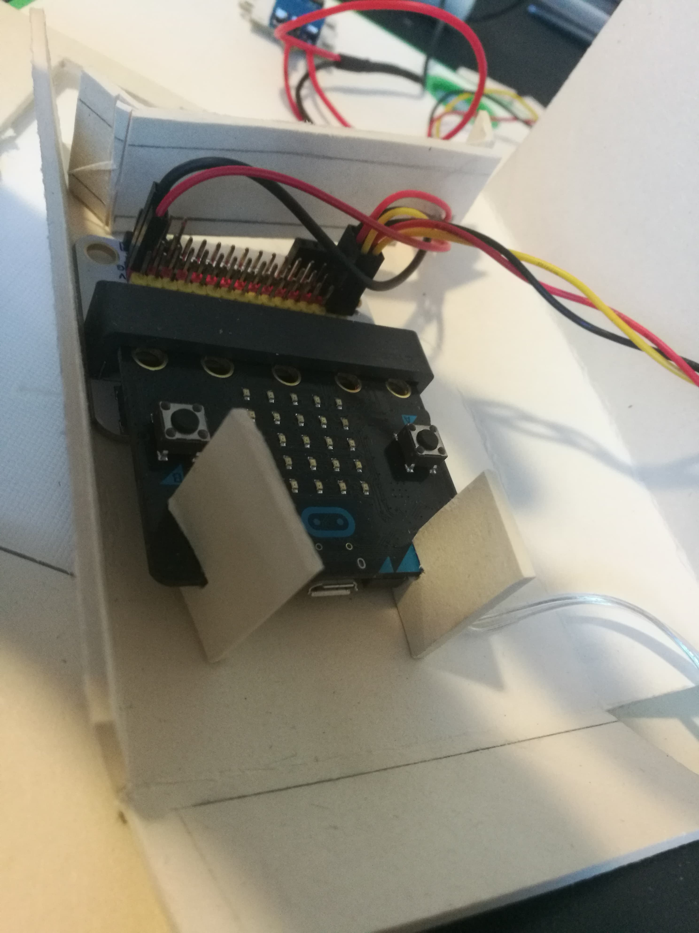 Begynnelsen på en MVP (minimum viable product). Første ting var å lage en ny boks siden den første jeg lagte ikke er stor nok til å legge inn kabler etc. Gjennom prosessen her også måte jeg finne ut hvordan jeg skulle støtte de forskjellige elektronikk dellene inni boksen. Jeg hadde en tanke på hvordan, men usikker på hva som var lettest. Som du kan se på bildene under fant jeg ut at det letteste var og lage en ¨plattform¨ for micro:biten til å stå på, samtidig som jeg lagde støtte rammer for sidene, sånn at micro:biten kunne stå stødig og strakt.