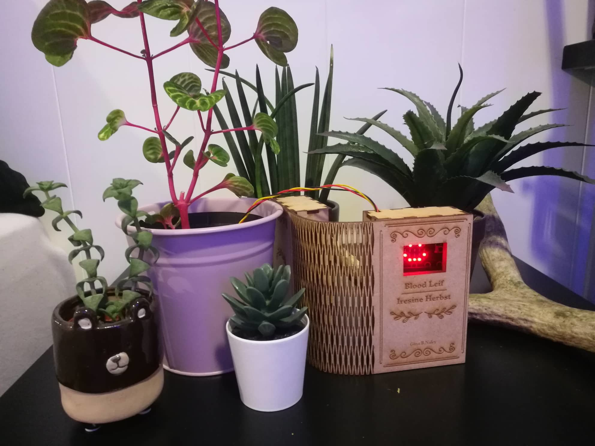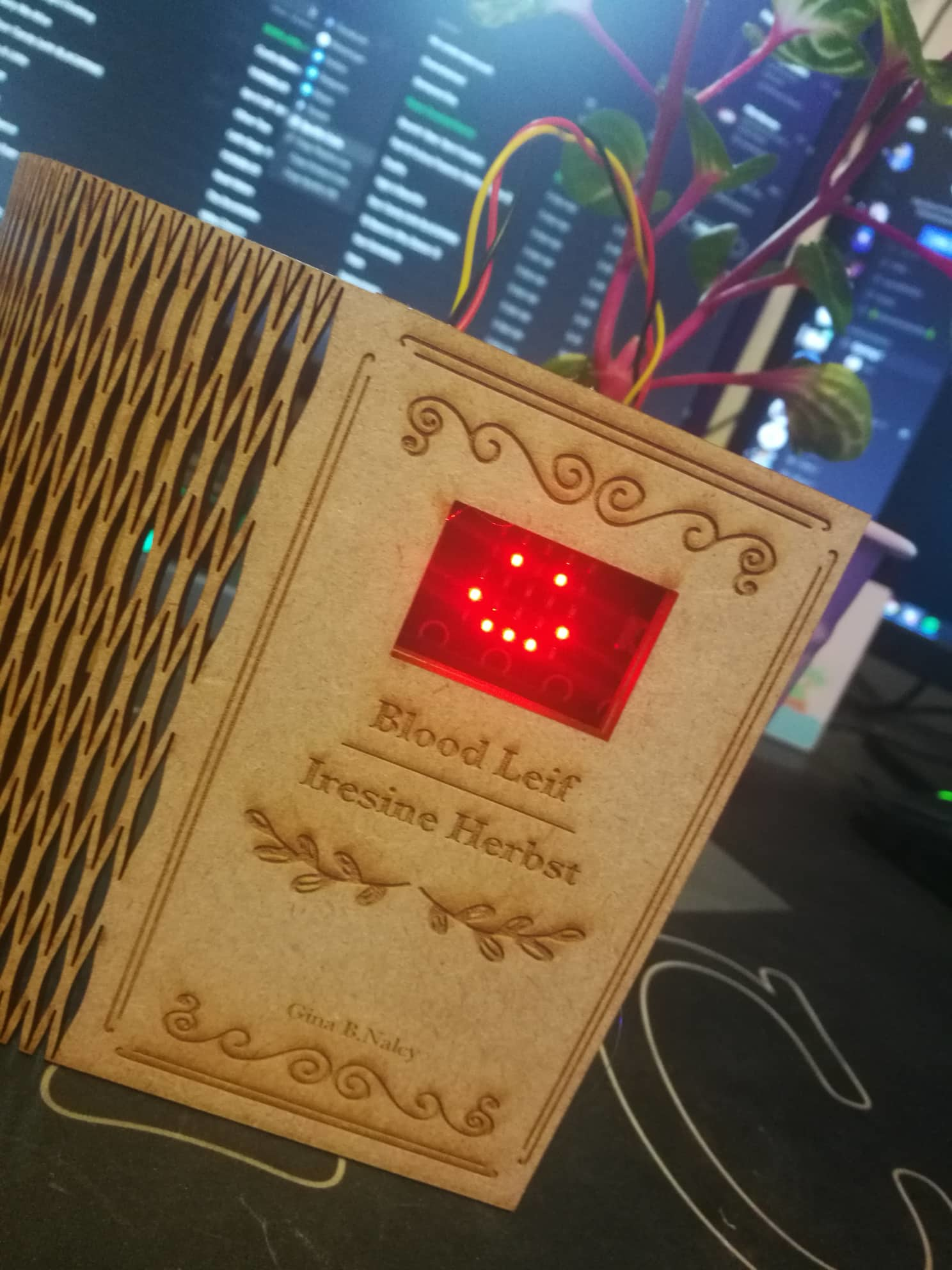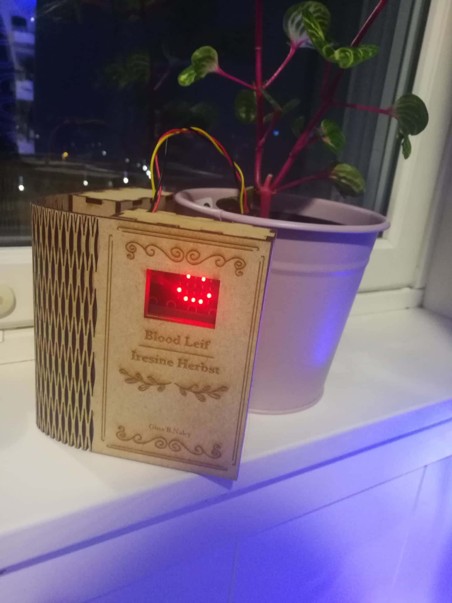 Her er det endelige produktet som er inni skiltet som holder alt av elektronikk sammen! Jeg har nå bare batteri og en fuktighets sensor tilkoblet! På forsiden av boken er det et vindu som indikerer når planten trenger vann, ved å vise et “trist smilefjes” når den trenger vann (fuktighet), og et “smile” når den har nok vann (fuktighet). Det du kan lese på forsiden av boken er navnet jeg har gitt planten, “Blood Leif”, og det botaniske navnet “Iresine Herbst”. På innsiden av boken har du informasjon om hvordan du passer på planten: