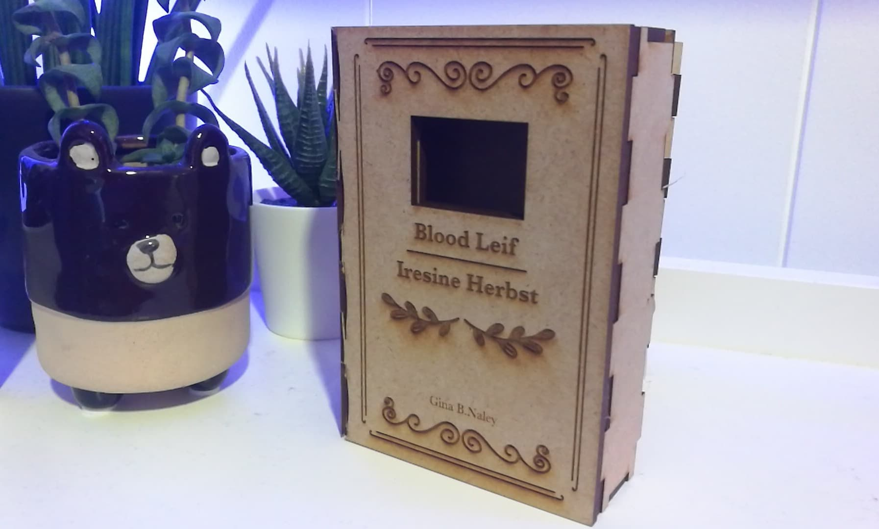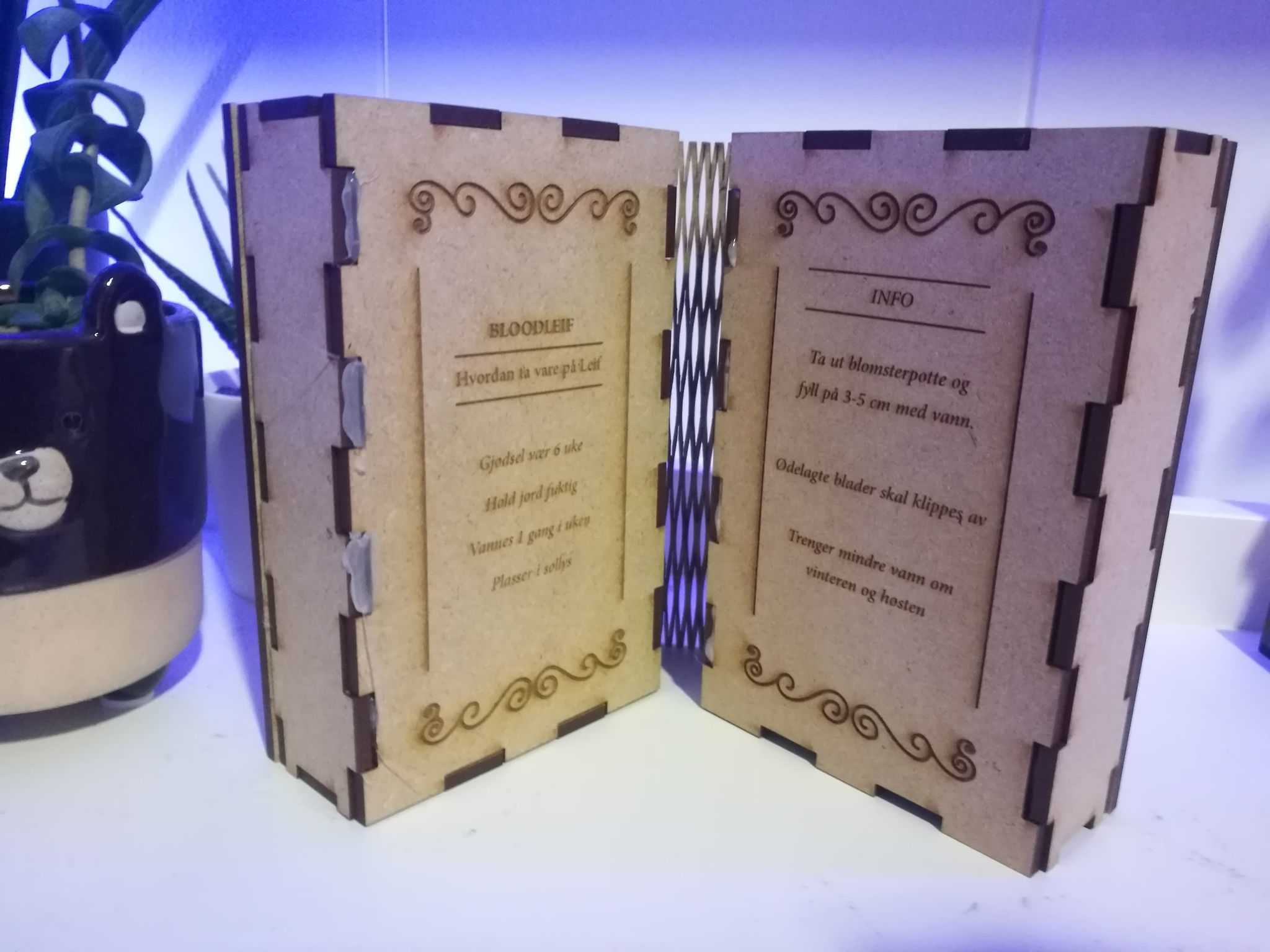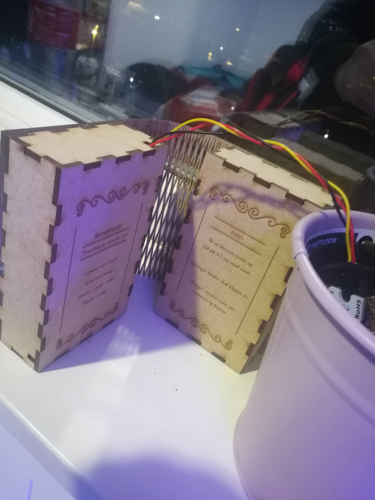 Her er det endelige produktet som er inni skiltet som holder alt av elektronikk sammen! Jeg har nå bare batteri og en fuktighets sensor tilkoblet! På forsiden av boken er det et vindu som indikerer når planten trenger vann, ved å vise et “trist smilefjes” når den trenger vann (fuktighet), og et “smile” når den har nok vann (fuktighet). Det du kan lese på forsiden av boken er navnet jeg har gitt planten, “Blood Leif”, og det botaniske navnet “Iresine Herbst”. På innsiden av boken har du informasjon om hvordan du passer på planten: