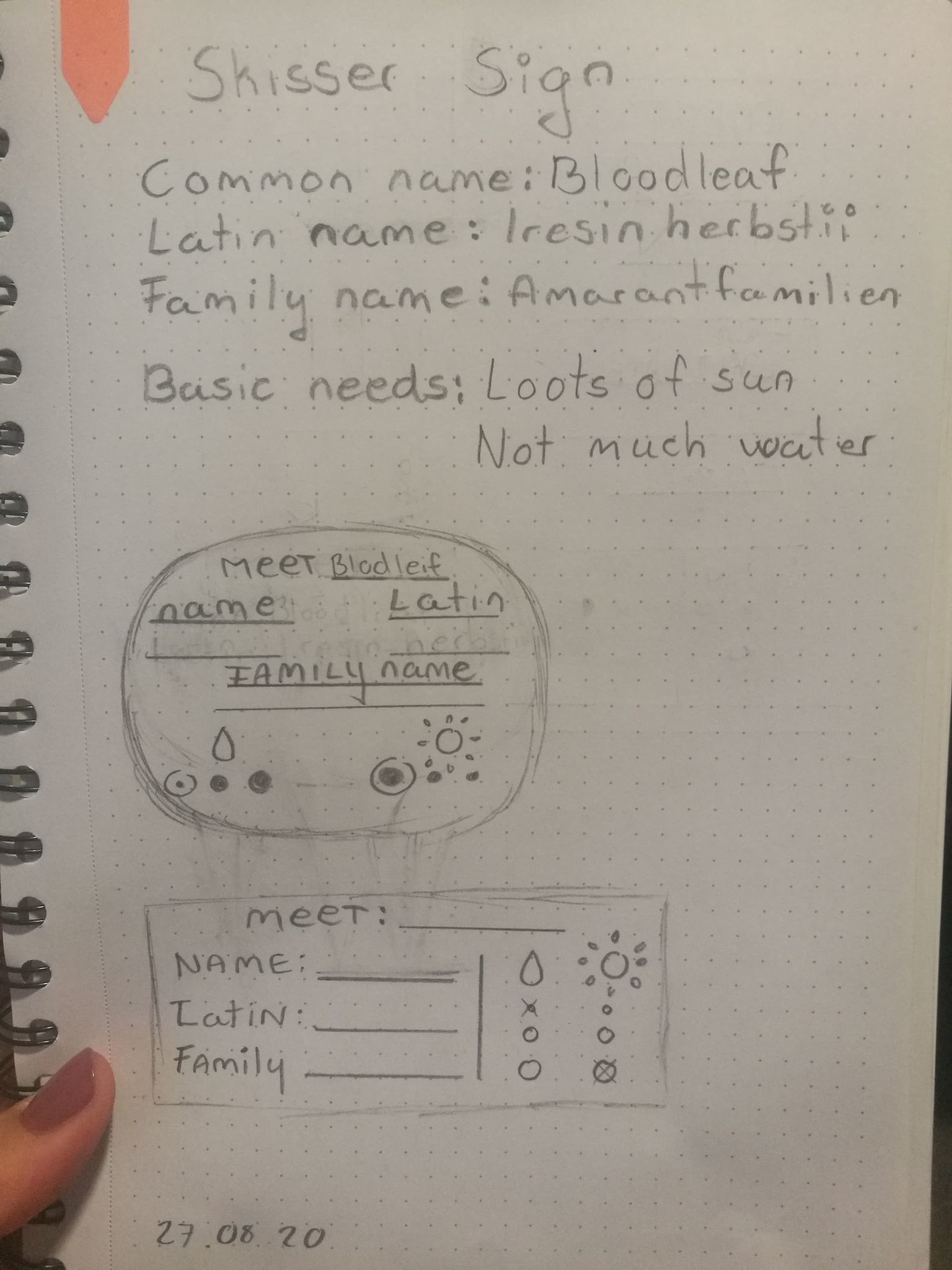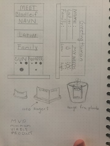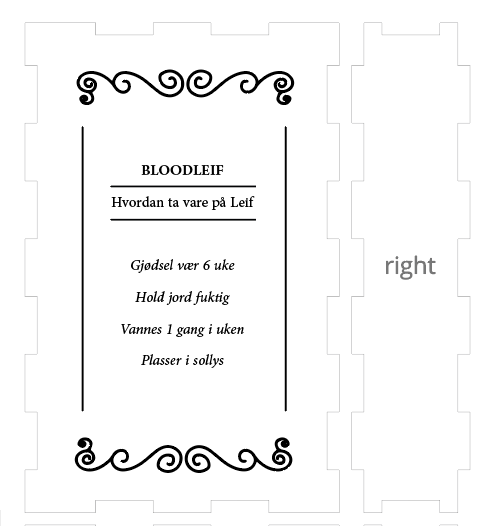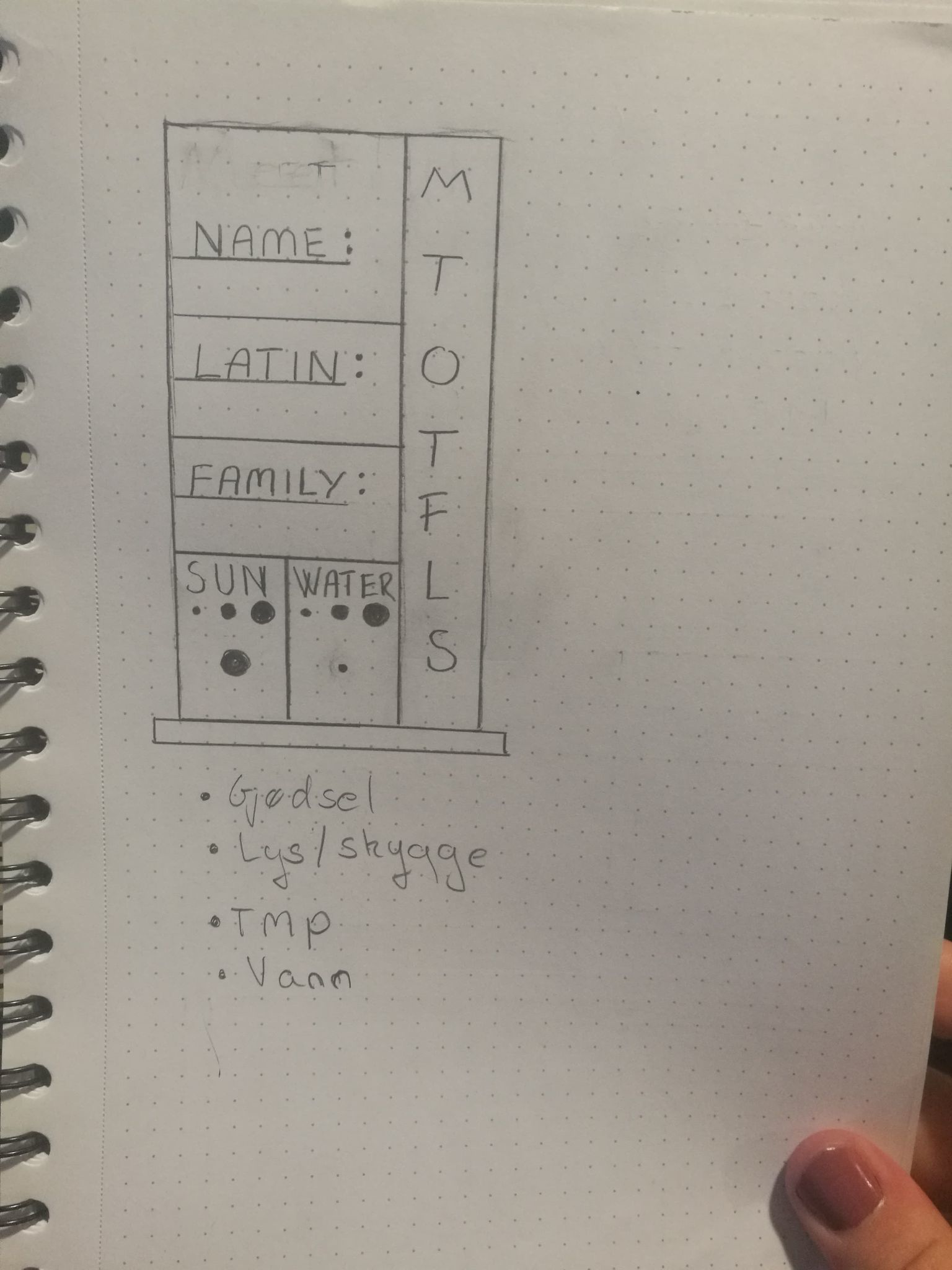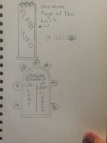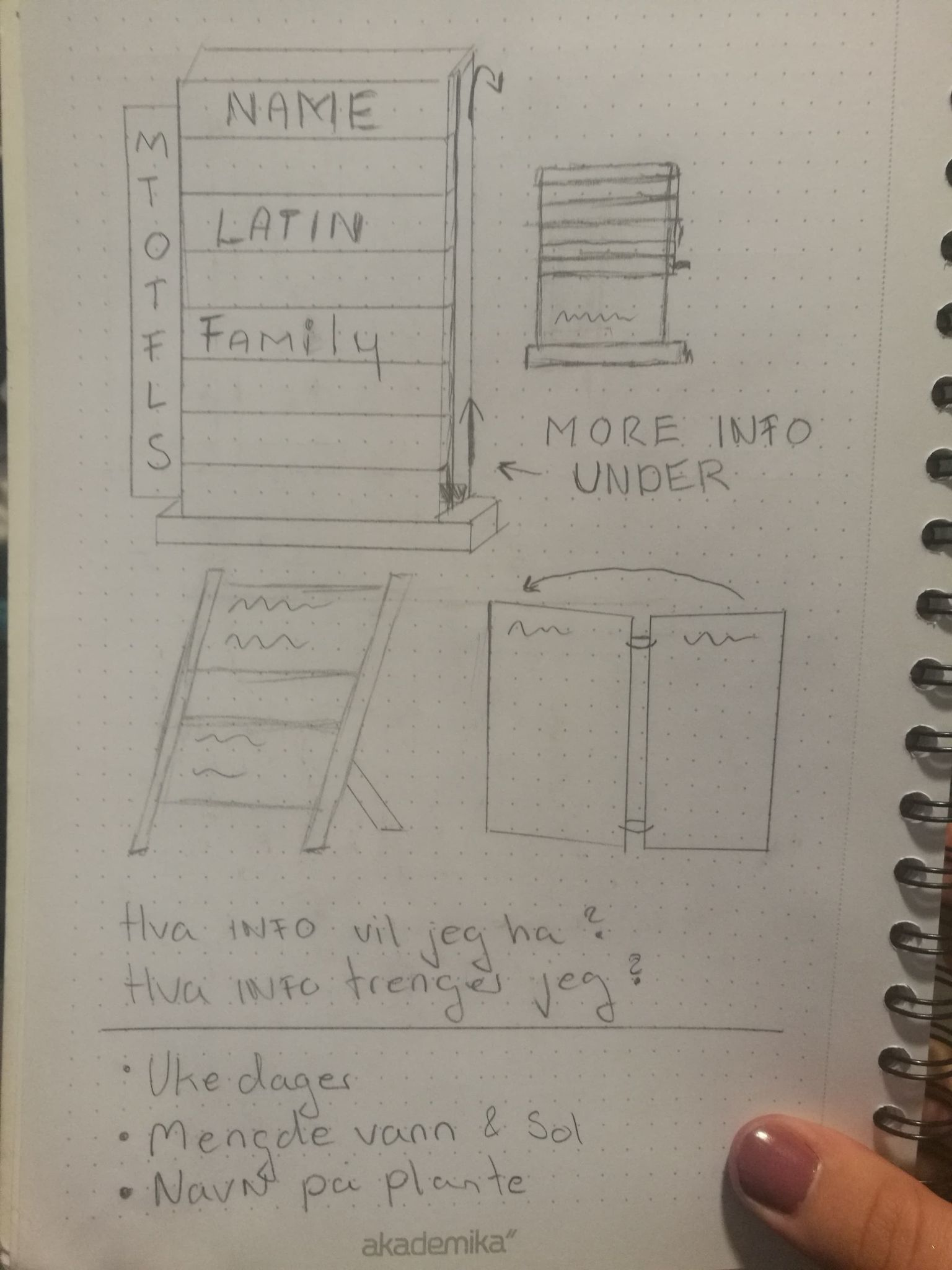 Tenkte først jeg vil ha et skilt som var i selve potteplanten, men etter å ha tegnet og tenkt litt så vil jeg ha et stående skilt foran planten. Det gjør det lettere for folk å ta opp skiltet og lese bedre, Og jeg unngår og få jord over hele hybelen. Jeg har også lyst å ta med uke dagene på skiltet, slik at jeg kan bruke skiltet som en påminnelse om når jeg sist vannet planten.