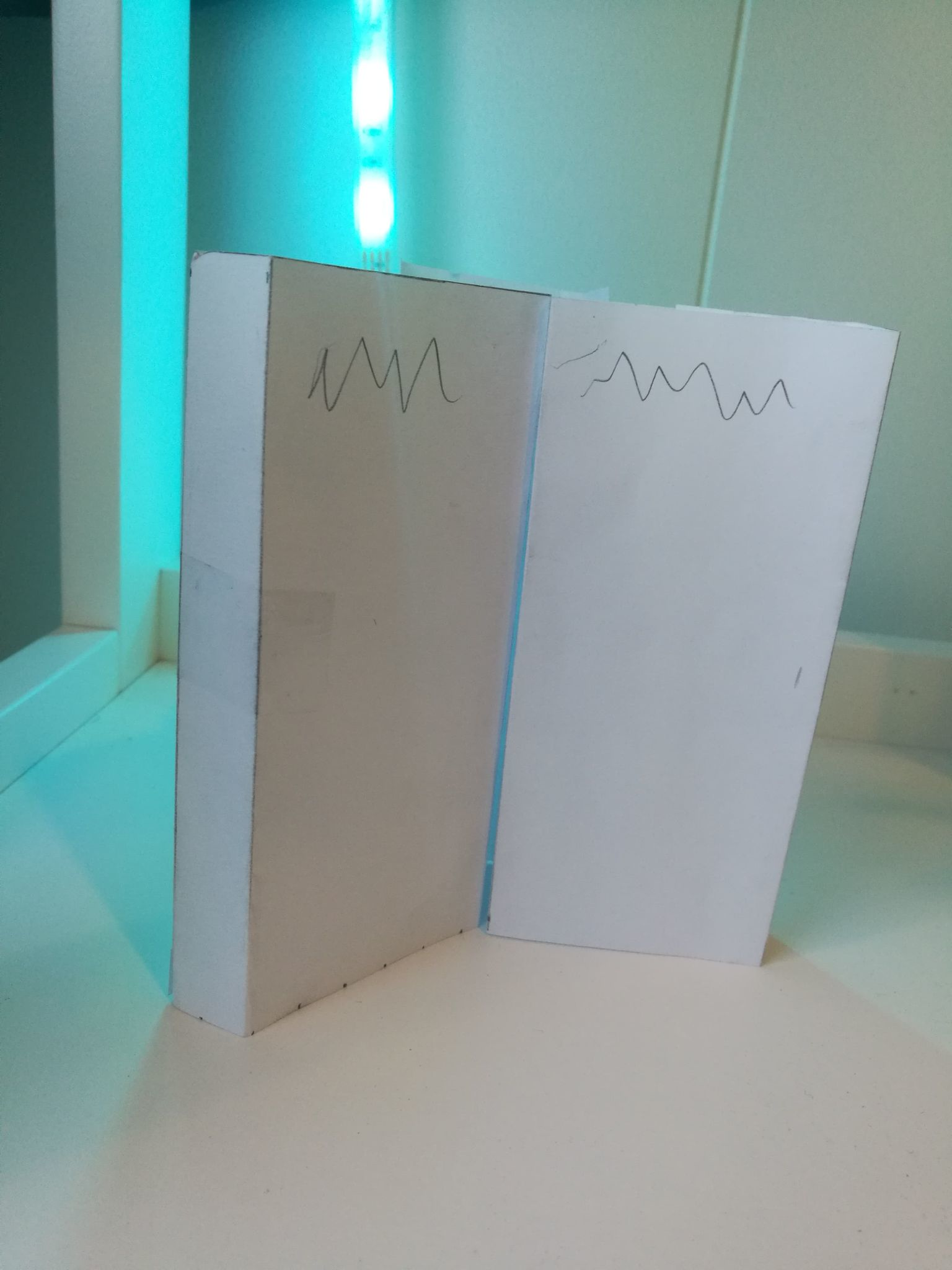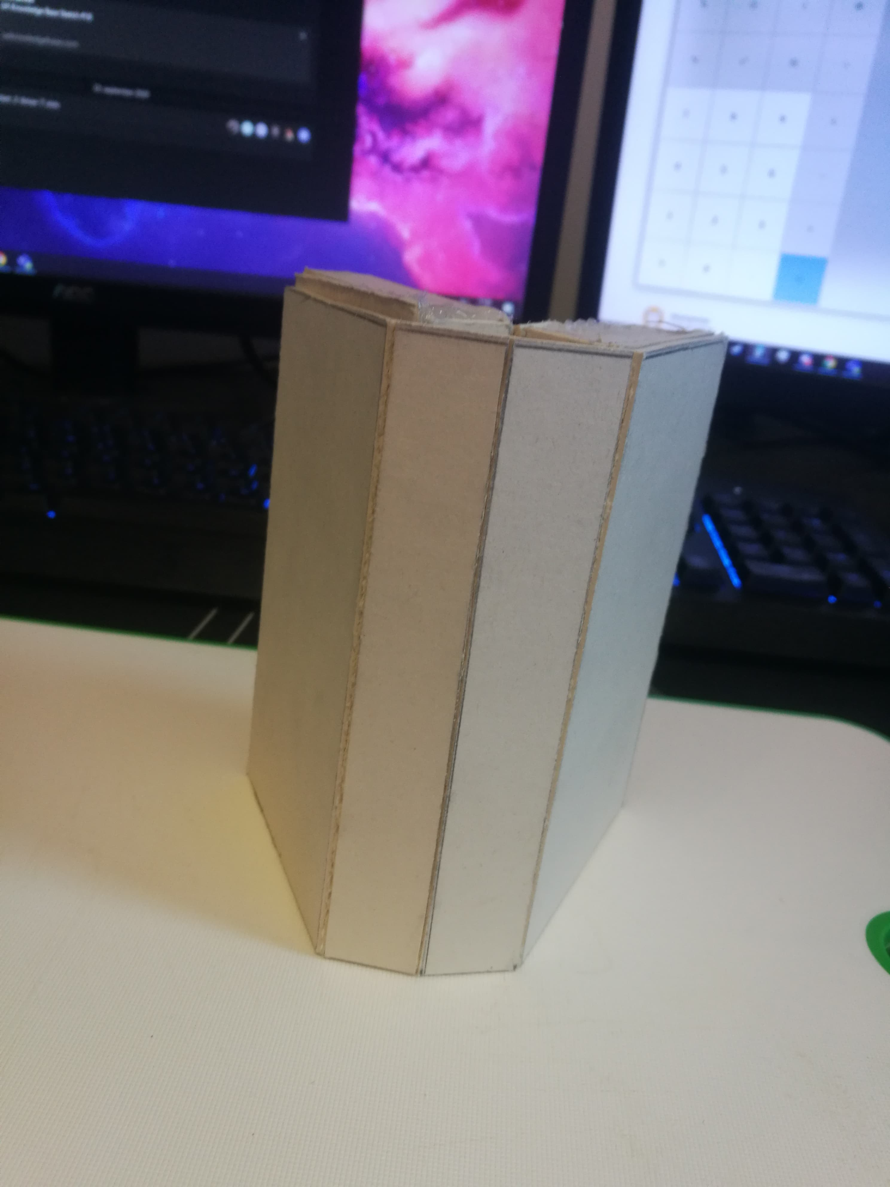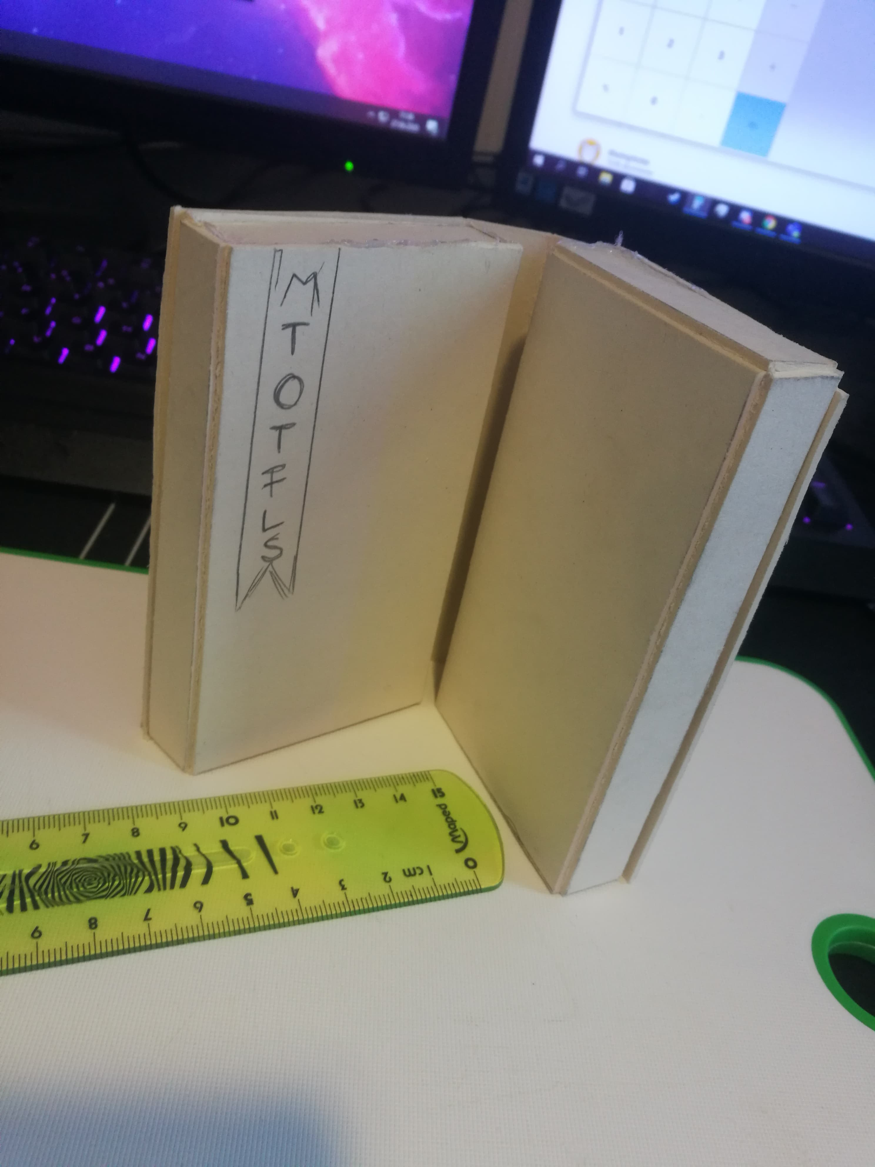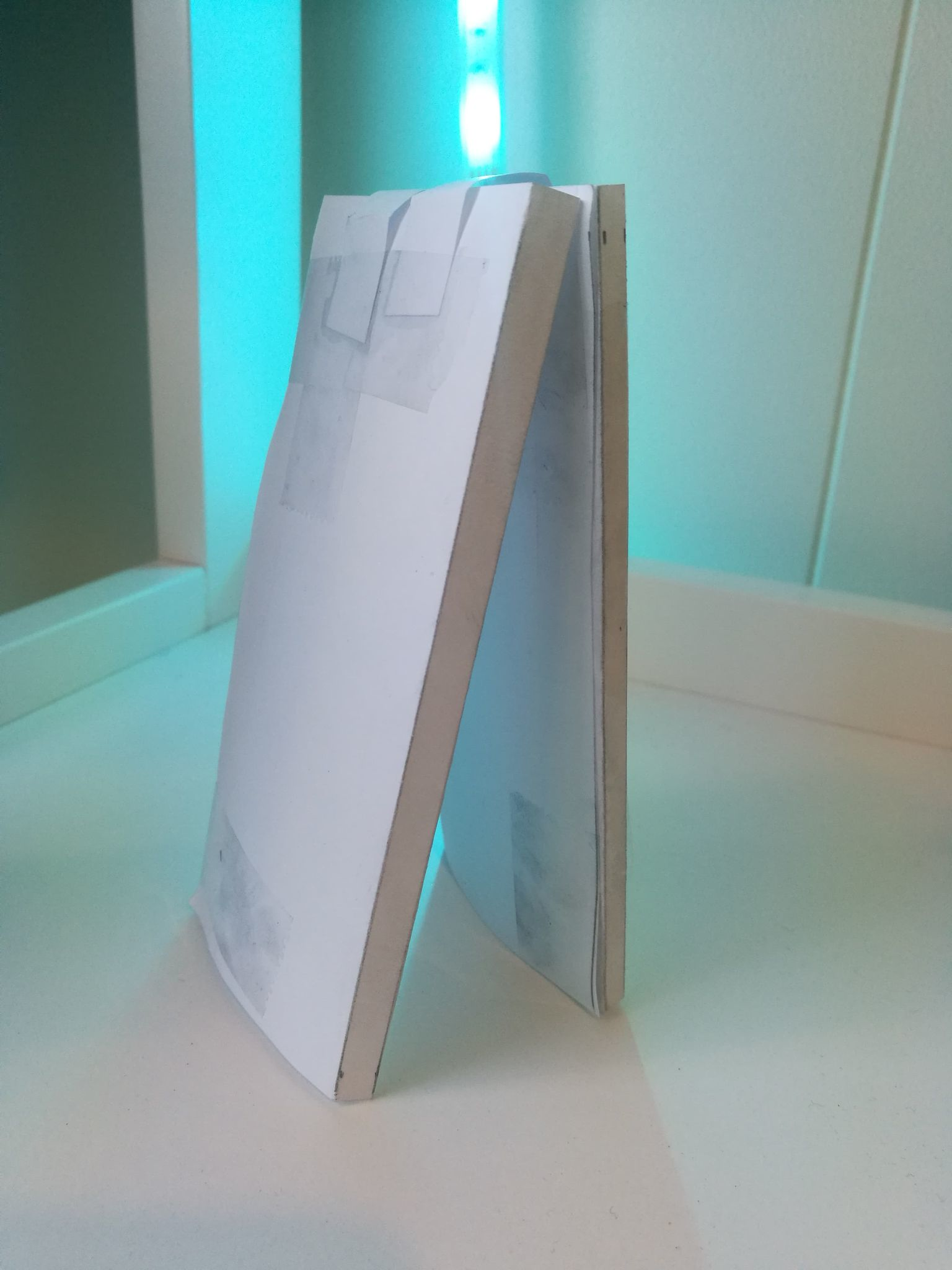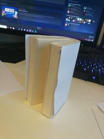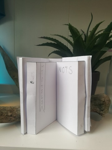 Jeg prøvde å finne ut den beste måten å gjøre det på. Først testet jeg ut med papir. Jeg fant litt patafix og prøvde ut hvordan det hadde funket med papir. Før jeg begynner å kute mer papp ut. Jeg må finne ut en måte og kutte papen sånn at jeg har mulighetne til og åpne å lukke boken effektivt.