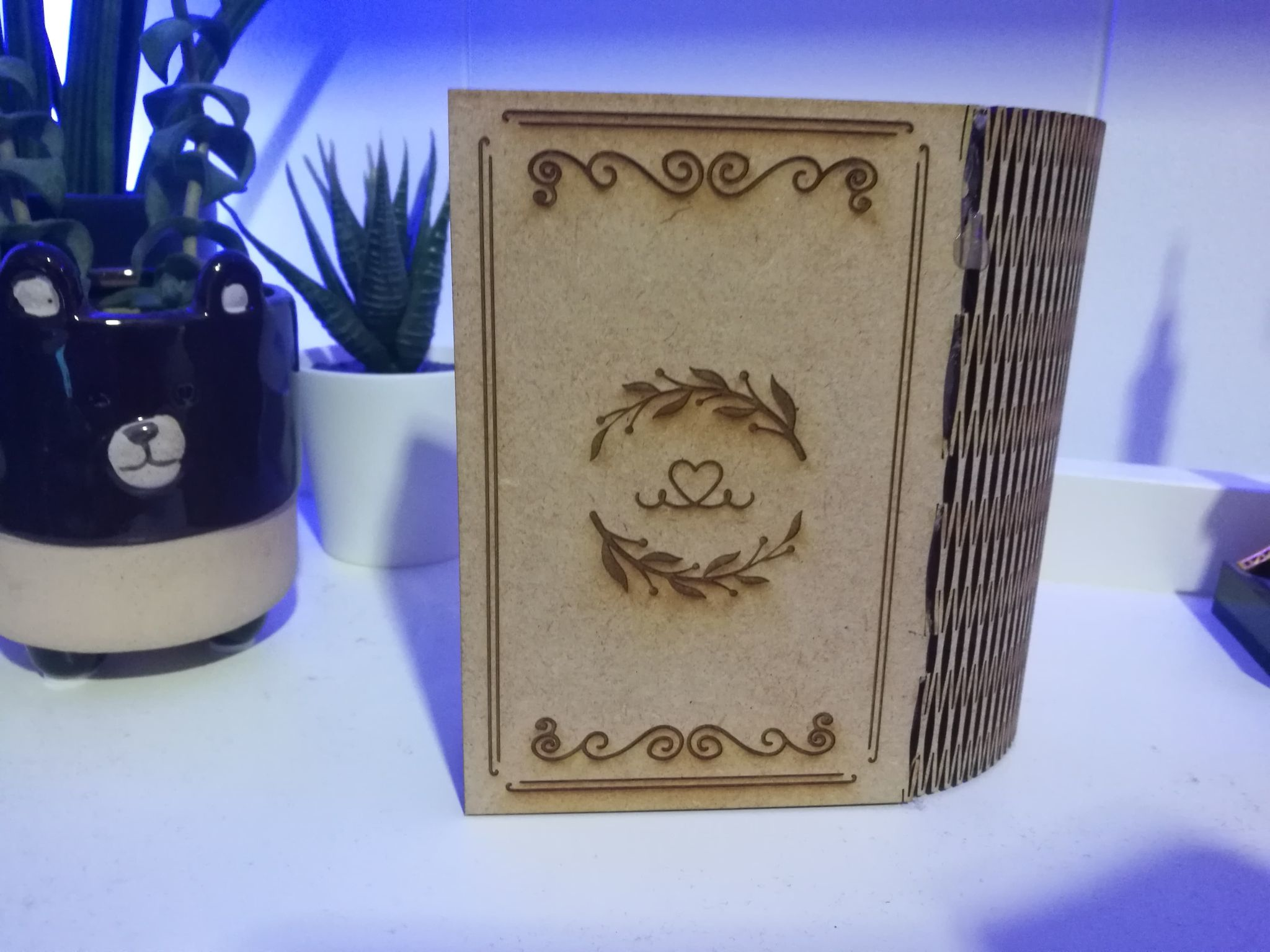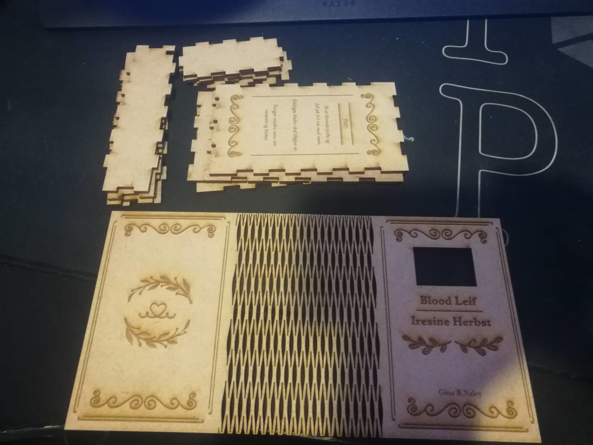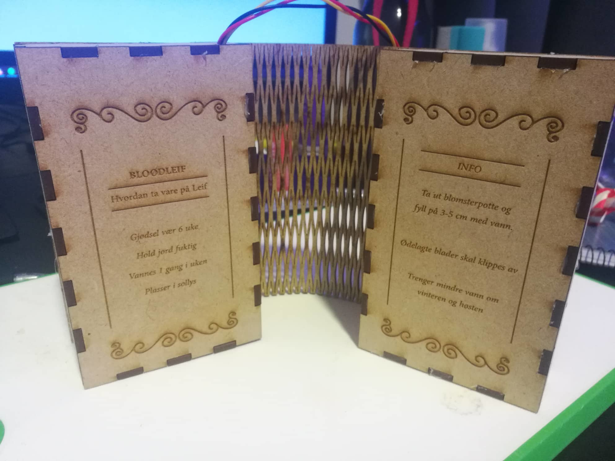 Boken har også fått graveringer sånn at den skulle se litt mer “vintage” ut, og få en ¨bok¨ følelse og ikke bare se ut som en boks. Jeg har også lagt til bilder av justeringer jeg gjorde på min siste laserkutting, som å justere passeringen av hulene som kablene skulle gå igjennom.