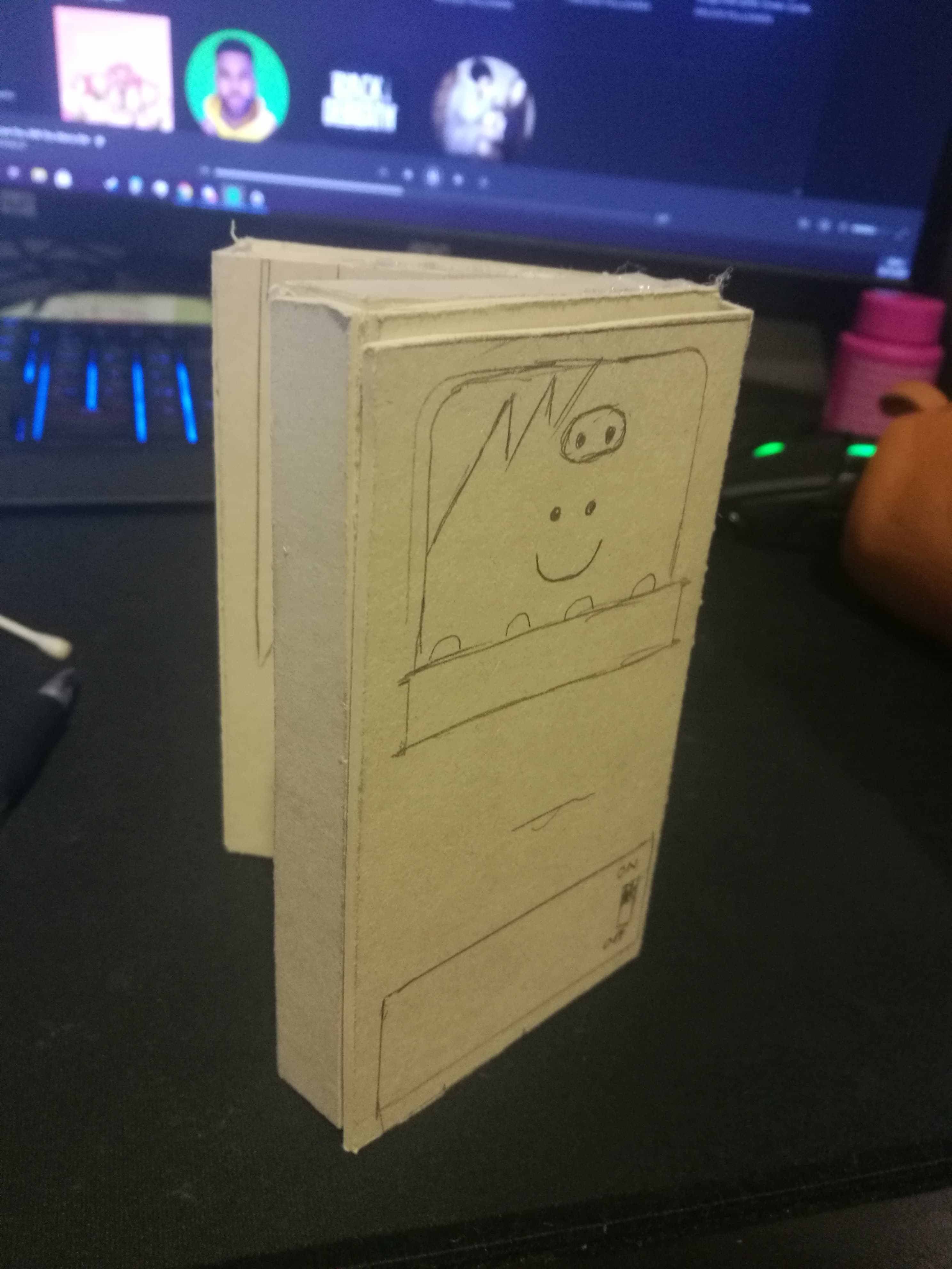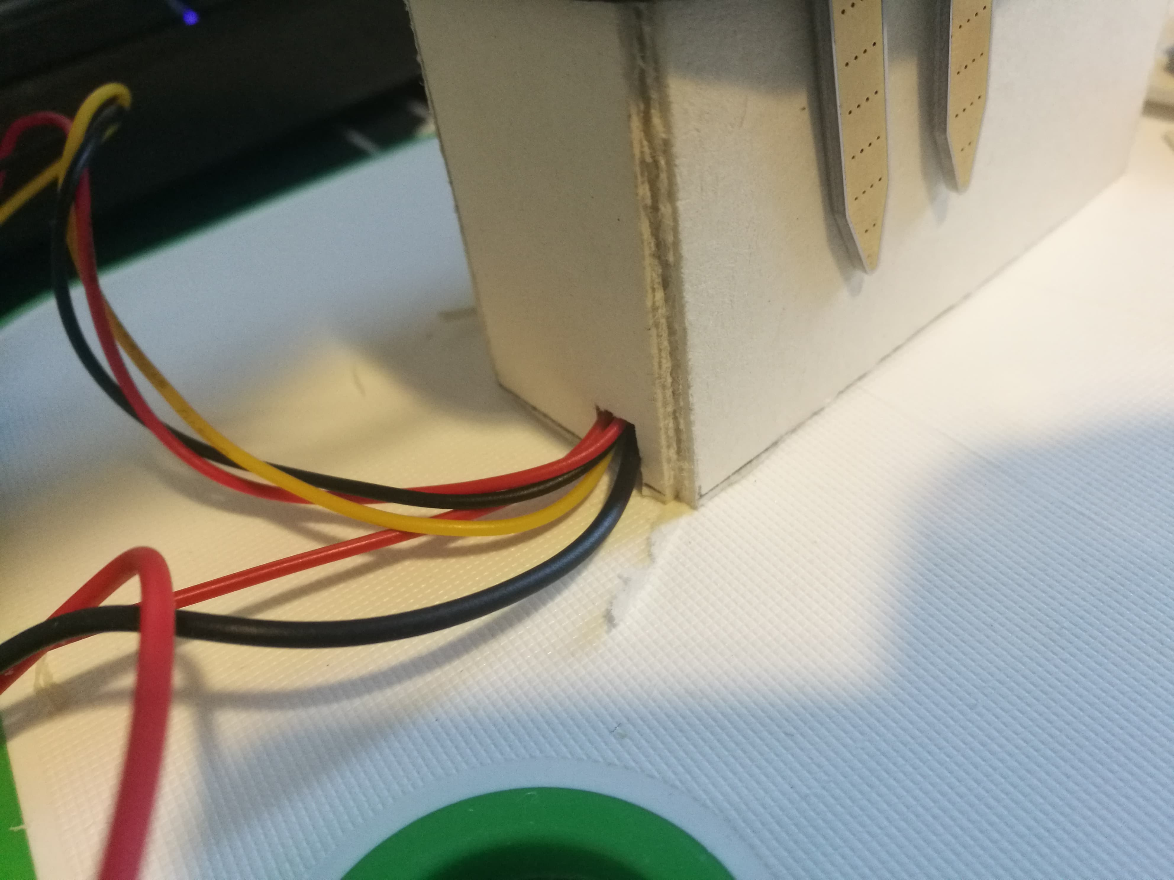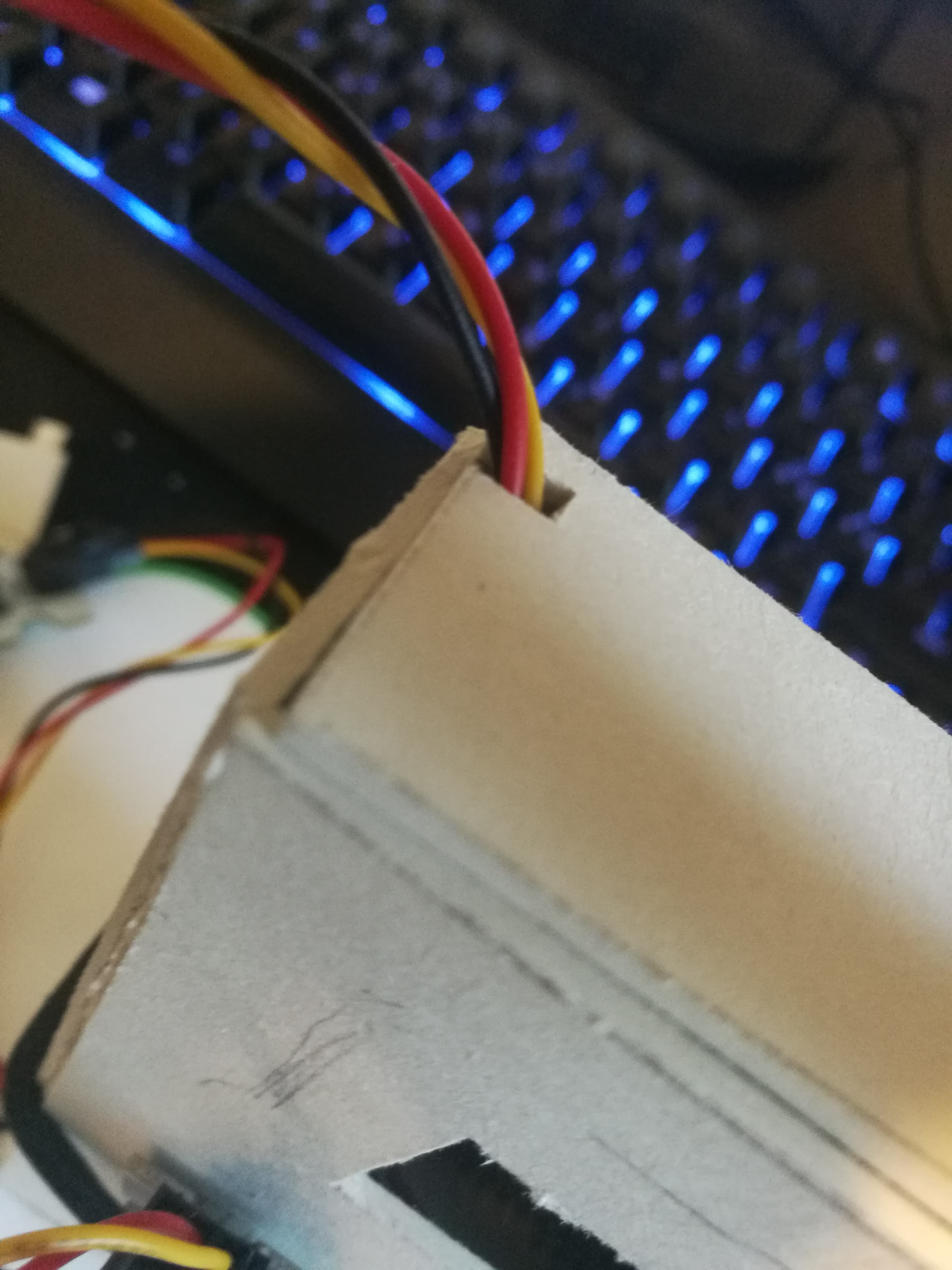 Til slutt lagde jeg små hull i toppen av boksen og, på rammen til boksen, sånn at kabler kunne gå igjennom mer effektivt.