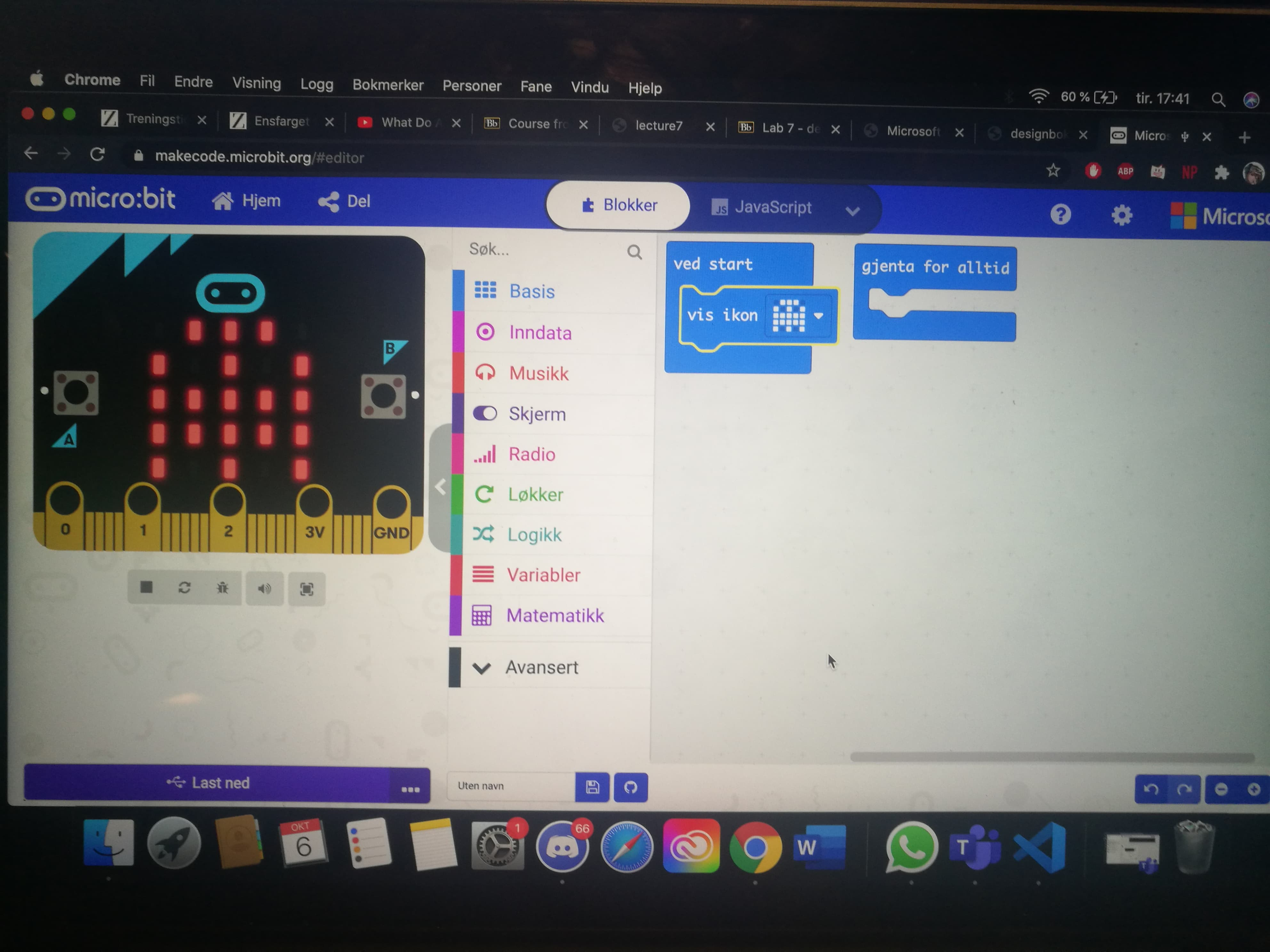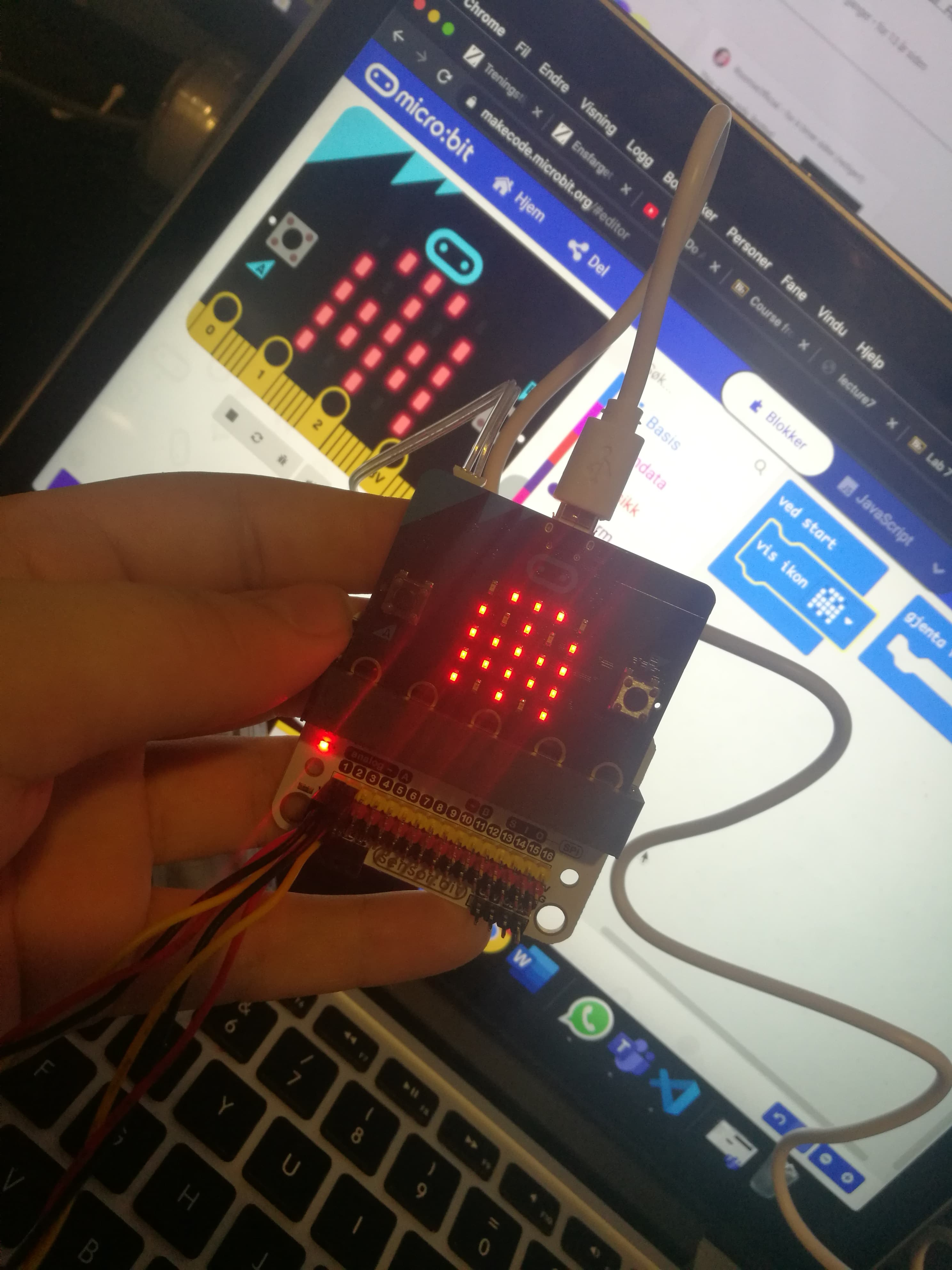 Jeg er nå tilbake til pulten hvor jeg skal fortsette å kode og prøve å finne ut hva problemet er. For øyeblikket vet jeg ikke hvorfor det ikke fungerer. Oppgaven i dag er å finne ut hva problemet er, og forhåpentlig hvis fikse det. Lysene på Micro biten funker, men jeg får ikke pumpen eller fuktighets sensoren til å fungere.