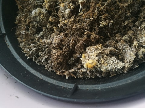Hvordan jeg kan ordne dette er å ta vekk den mugne jorden, og stoppe å spraye vann på bladene. Etter et par uker burde det ikke komme mer mug, men hvis det kommer mer må jeg bytte jord på hele planten.
