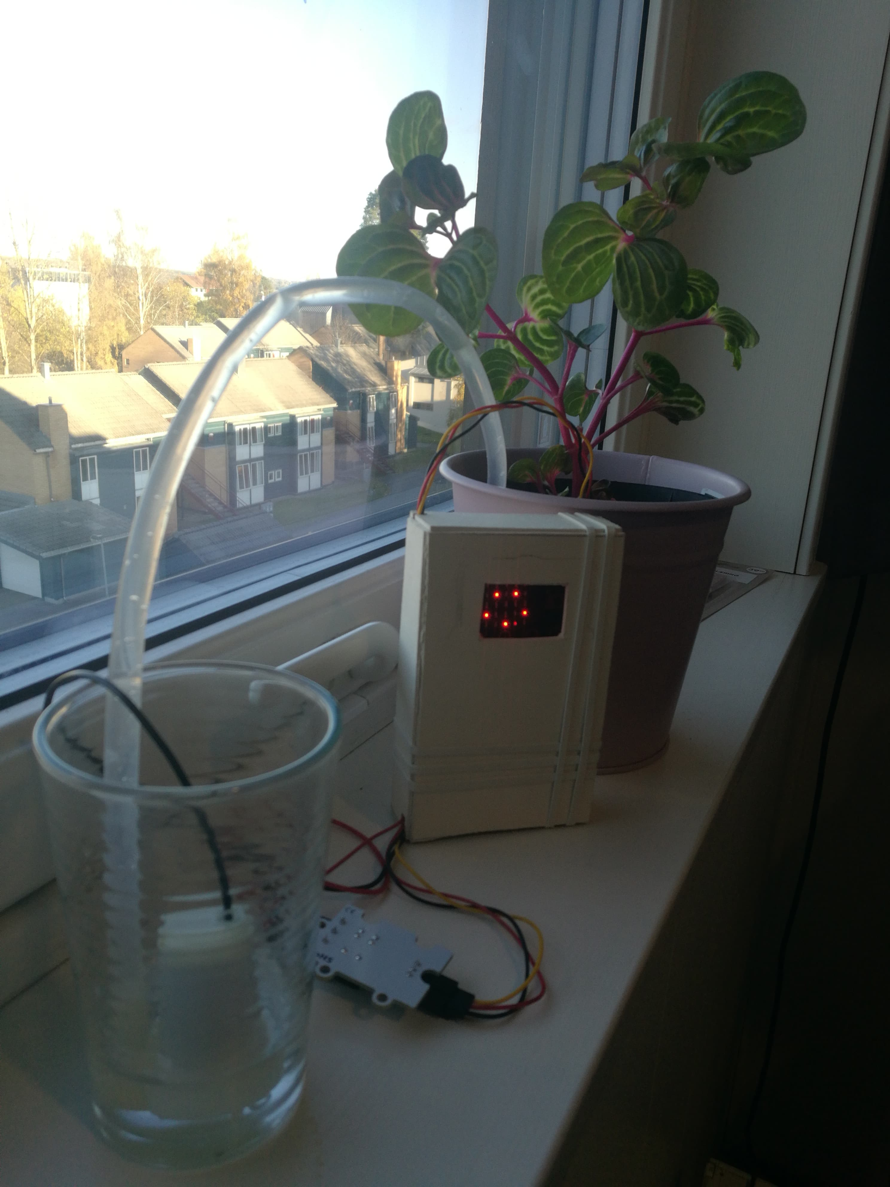 Til nå har jeg ikke hatt noen problemer med skiltet. Lys og alt har holdt nå i over 1 uke. Det var ikke før på torsdag jeg begynne å bli nysgjerrig på om alt var riktig. Vanligvis vanner jeg “Blood Leif” hver torsdag. Sensoren viste fortsatt at det var fuktig i jorden, så jeg ventet til fredag. Fredag morgen viste skiltet fortsatt at jorden var fuktig, jeg ventet så til lørdag. Husker ikke når på lørdag men skiltet viste endelig at jorden hadde mangel på fukt! Jeg var over skyende og gleda meg til å se om pumpen hadde pumpet vann, men det var fortsatt vann i glasset. En nærmere titt på skilte så skjønte jeg at skilte nærmet seg tom for strøm. Jeg må gjøre litt mer testing med kodingen til micro:biten!