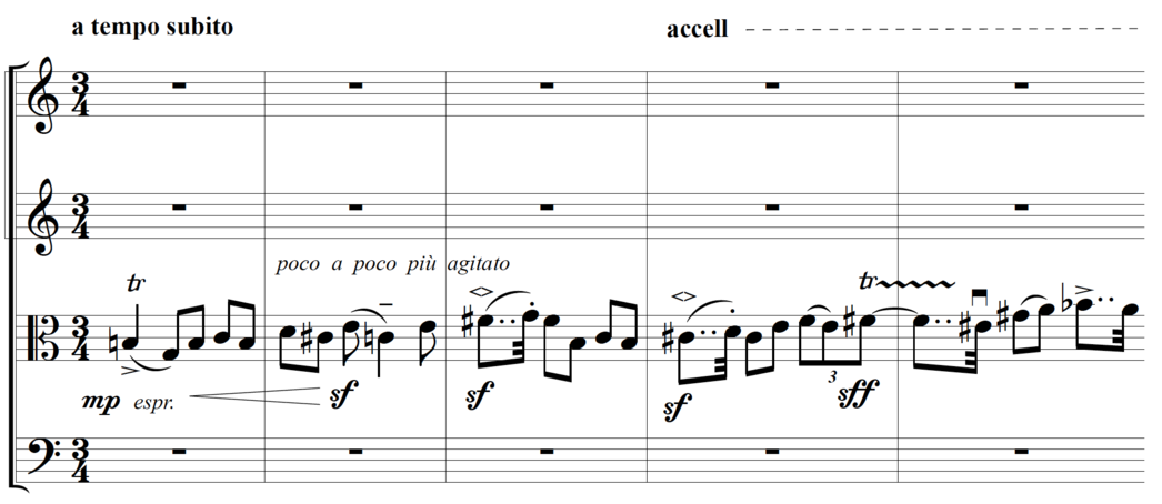 See illustration 2: “String Quartet No. 2”, 1st movement, 5 measures after rehearsal No. 20, viola -