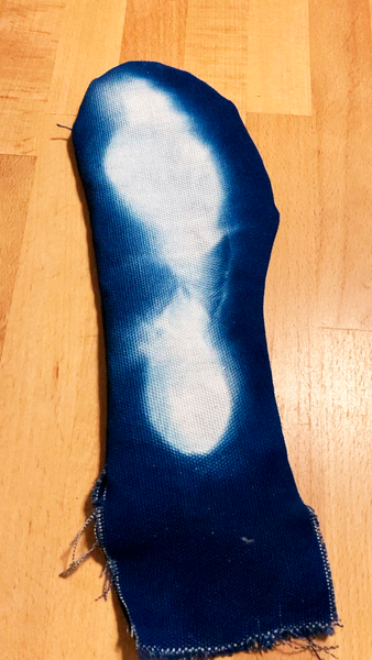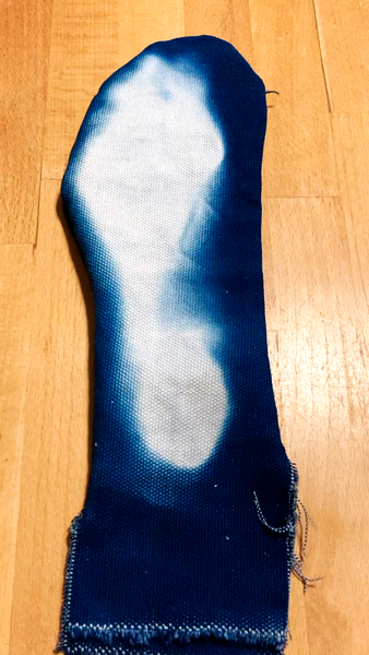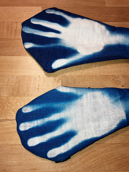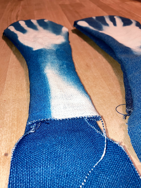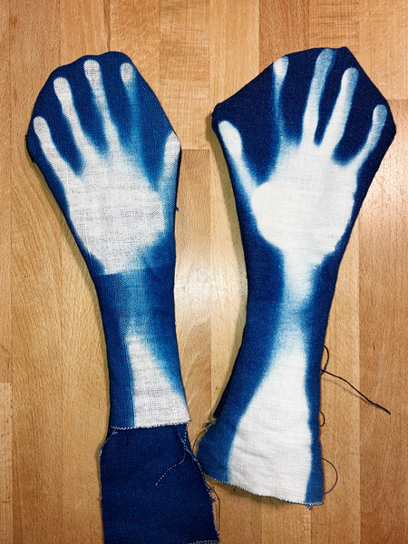 Slideshow left and right, video center: experiments with creating a body suit of cyanotype-exposed pieces of linen fabric in natural scale, producing white (non-exposed) shadows on blue (exposed) background. The final bodysuit will enact as an inside-out skin portrait of my body, as each exposed backside is stitched together as frontside.