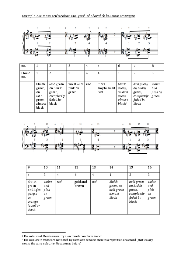 - chord 4: Messiaen, red; person 1, green; person 2, blue. Person 1 is not entirely consistent with the colour for this chord: when it returns (nos. 34 and 35), the colour is described as orange, probably because of the register