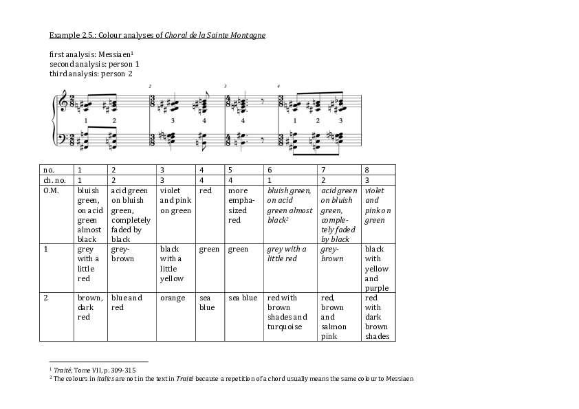 In an interview with Samuel85 (1986) and in Traité, Tome VII86 (2002), Messiaen gives a detailed chord-by-chord colour analysis of Chorale de la Sainte Montagne. The 2nd chorale in La Transfiguration, Choral de la Lumière de Gloire is not analysed by Messiaen, but is mentioned in his analysis of La Transfiguration in Musique et couleur:87