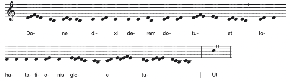The text could be divided into two phrases: ‘Magnus Dominus, et laudabilis nimis’ and ‘in civitate Dei nostri, in monte sancto ejus’. The first phrase has 12 syllables, the second one 16. Because of the repetition of the words ‘in civitate’, ‘Dei’ and ‘monte’ in the second phrase, this phrase has 28 syllables in total and is almost twice as long as the first. A division based on the musical phrases, also shows a division in two sections: section 1, bars 1-16; and section 2, bars 17-31. Because of the cadence in bar 16, bar 17 feels like the start of a new phrase. However, these two musical phrases do not respect the two textual phrases: the first ends thus with ‘in civitate Dei’ and the second starts with ‘Dei nostri’.151