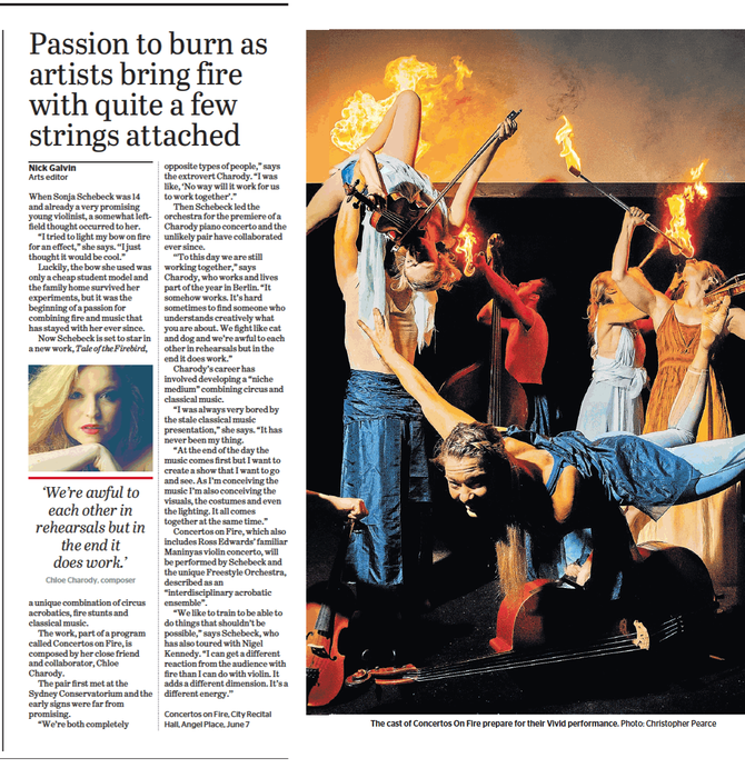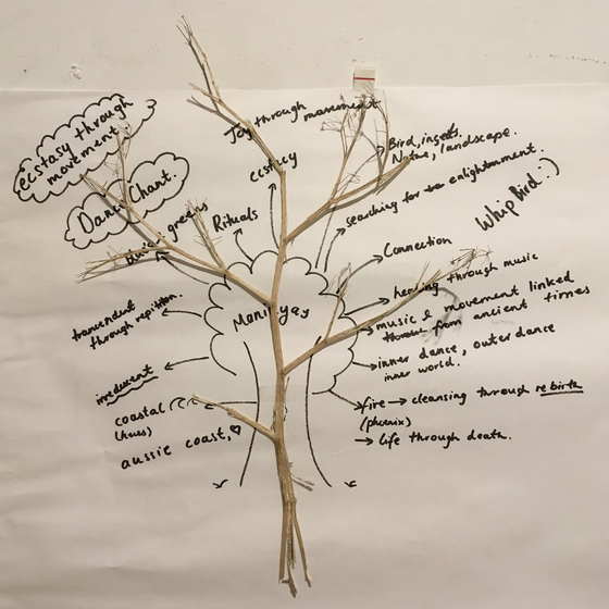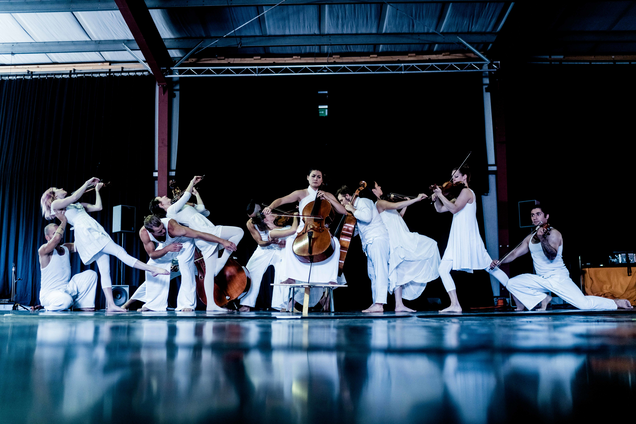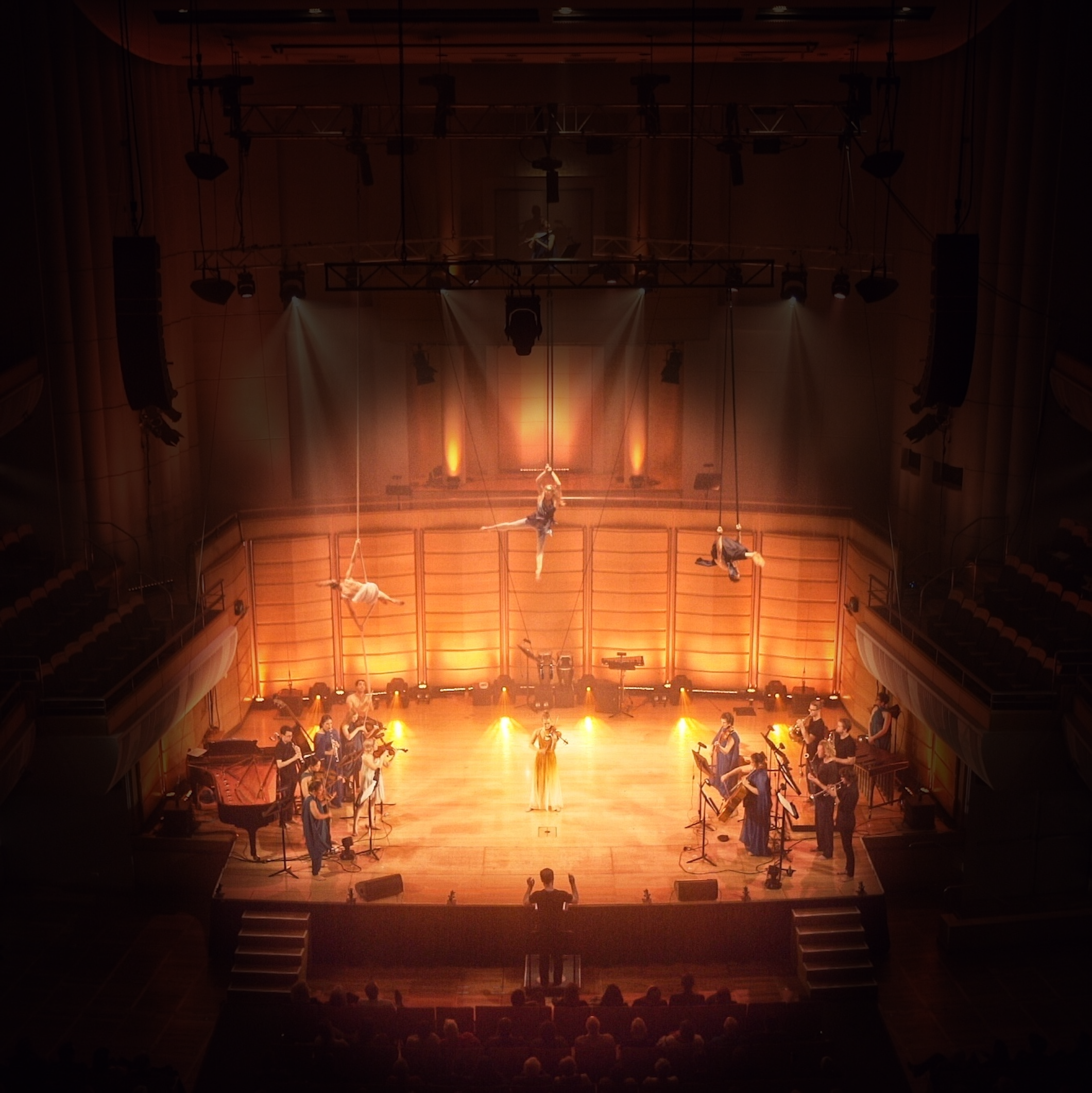 The Freestyle Orchestra is a performance collective of classically trained musicians exploring and questioning the limits of how an orchestra can express music in performance. They strive to create an aesthetic Gesamtkunstwerk on stage, incorporating physical movement, aerial arts, staging, lighting, costuming, and fire manipulation in live music performance. Building on contentions regarding the inherent physicality of musical performance as well as precepts within Embodied Music Cognition Theory asserting that meaning-formation is corporeal, they themselves research, train and perform as interdisciplinary artists, constantly experimenting with novel ways to communicate the movement and gesture they experience when listening to music more immediately to their audiences. The collective is convinced that this aspect of inherent physicality is something which has been sacrificed to the work-centric focus of classical music (and therefore neglected within conservatory training), and believe manifesting the movement they perceive within some music is a natural process which can itself generate meaning for both performer and audience. They envision the body as an instrument and strive to amplify musical gestures and meaning through physical movement, simultaneously enhancing and more deeply expressing their own understanding of musical compositions. This exposition introduces a 2019 collaboration with Australian composer Ross Edwards which resulted in a choreographed performance in City Recital Hall in Sydney of the composer’s Maninyas violin concerto. It combines audio-visual footage, photos and texts contextualizing the research process, which included contemplation and re-enactment of Edwards’ own musical journey in creating his Sacred and Maninyas styles, a way out of a personal musical crisis. Edwards’ perspectives on the ecstatic and fundamental connections between nature, dance, ritual and music/sound fed the physical and stage treatment as well as the processuel, experimental research of the Freestyle collective as they constructed their own, interdisciplinary performance of the concerto.