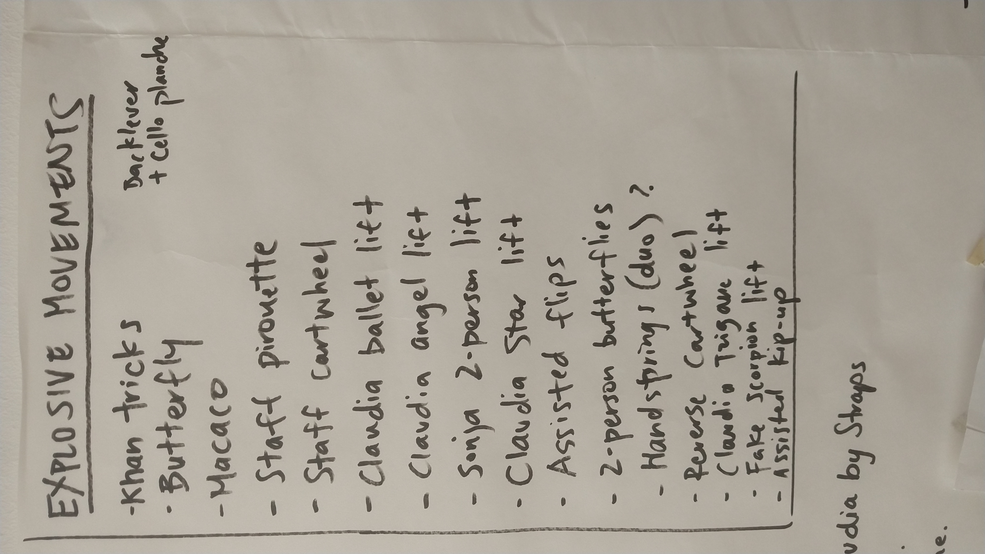 Trial and error and physical experimentation was a significant part of the process. For the floor movements, over 100 separate moves were researched, attempted, categorized by viability. The possibilities selected through this process were then further filtered based on: