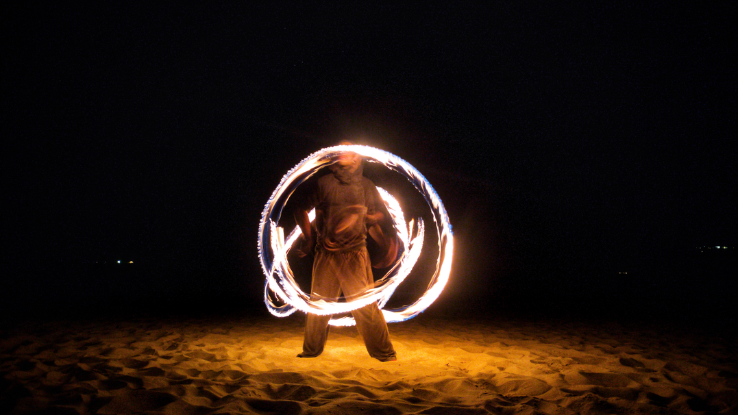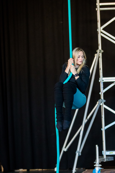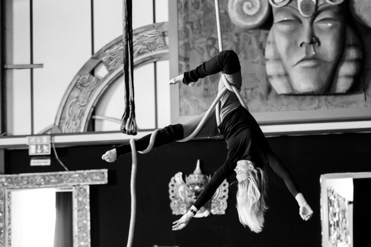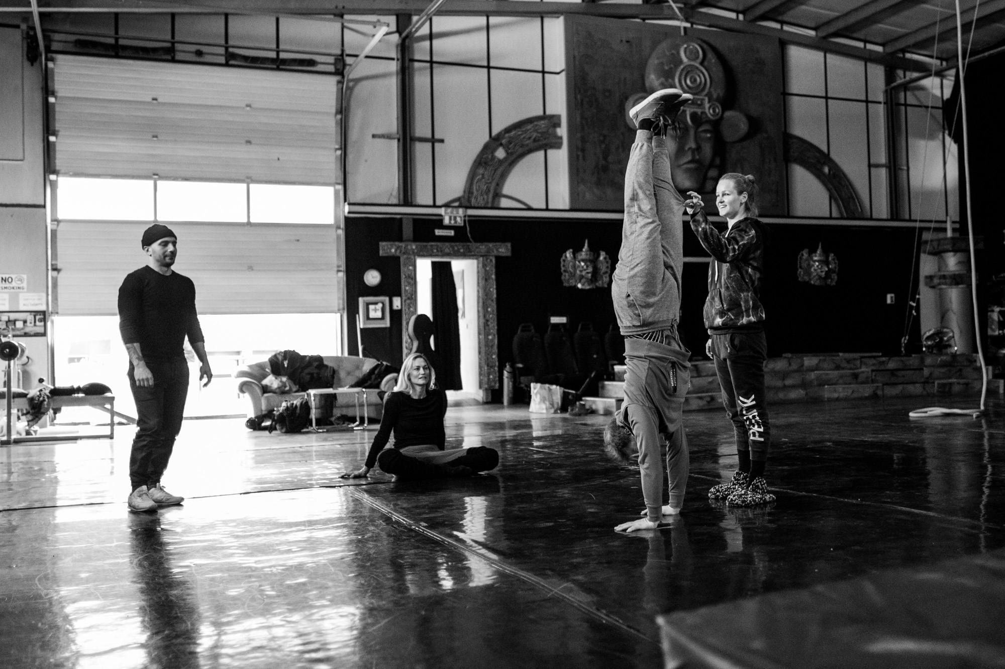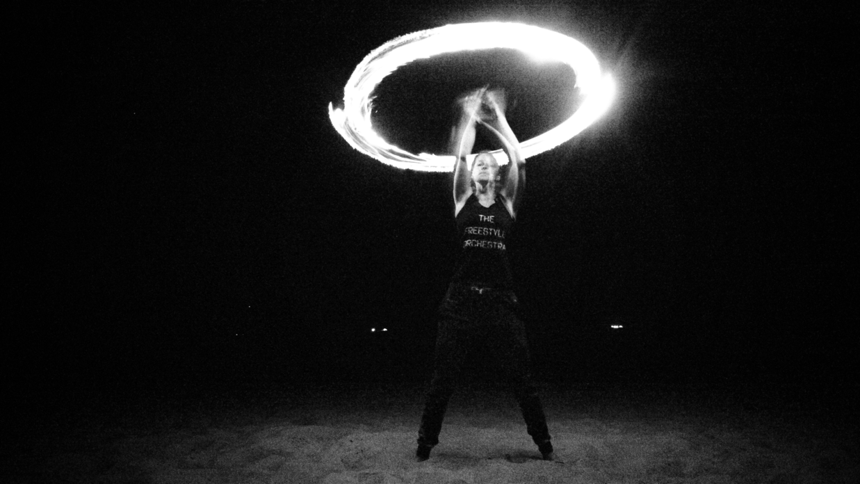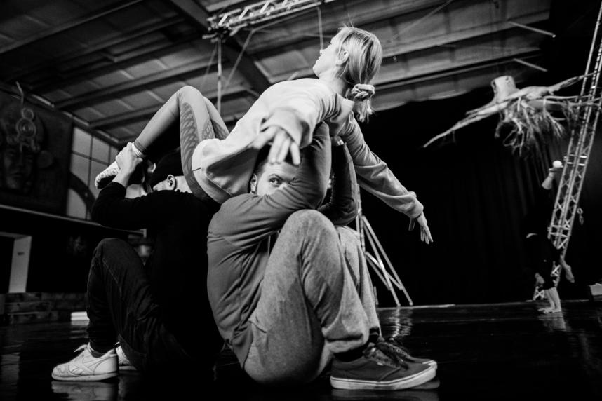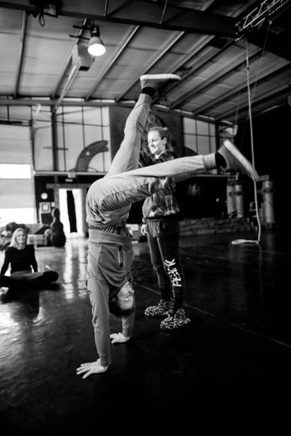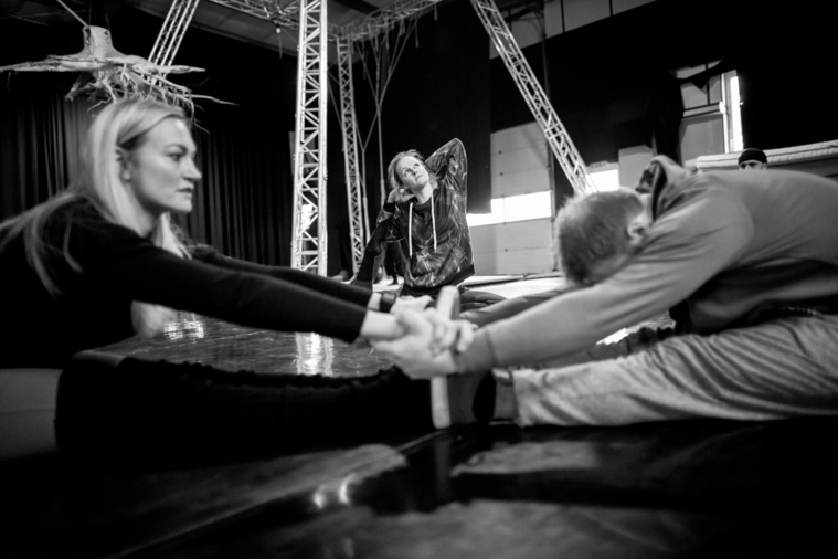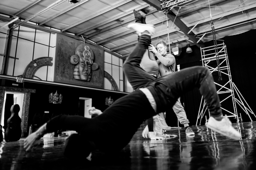 For this specific project, members of the ensemble trained multiple times per week both individually and together for over a year. They explored disciplines including gymnastics, aerial arts, breakdancing, modern dance, staff and fire manipulation.