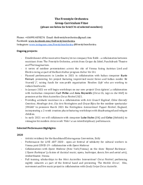 Through the development and popularity of contemporary circus, also known as “cirque nouveau”, led by groups including Montreal’s Cirque de Soleil, Archaos from France, Circus Oz in Australia and Pickle Circus in San Francisco over the past 40 years are clearly in line with The Freestyle Orchestra’s approach (as opposed to "traditional" circus), most contemporary circus utilize primarily original compositions and generally avoid classical music.