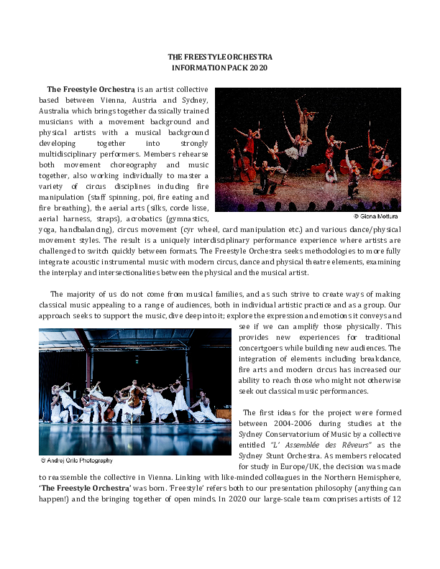 The Freestyle Orchestra is a performance collective of classically trained musicians exploring and expanding the possibilities of musical expression in performance. They strive to create an aesthetic Gesamtkunstwerk on stage, incorporating physical movement, aerial arts, staging, lighting, costuming, and fire manipulation in live music performance. Building on contentions regarding the inherent physicality and activity of musical performance (i.e. "to music") as well as precepts asserting that meaning formation is corporeal (e.g. embodied research theory), they themselves research, train and perform as interdisciplinary artists, and seek out innovative ways to incorporate aerial arts, dance, hand balancing and other movement formats into their own classical music performance practices.