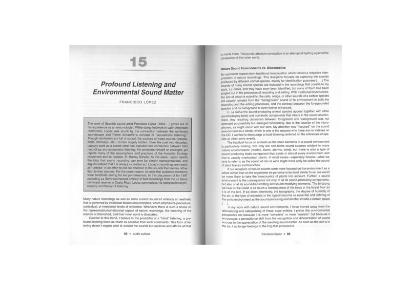 - López, Francisco. Profound Listening and Environmental Sound Matter. https://soundenvironments.files.wordpress.com/2011/10/lopez_listening.pdf