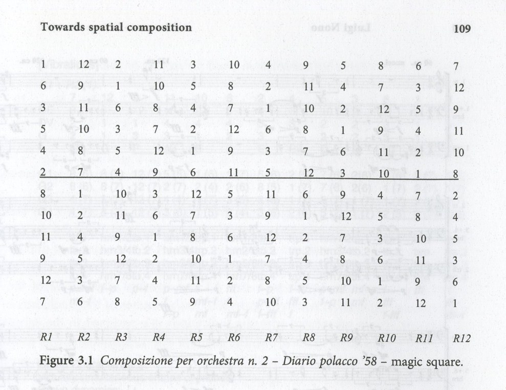 And that is precisely why I find the application of twelve-tone series so attractive. Its use offers the possibility of taking a structural approach to sequences and compositions consisting of clearly pitched sounds, as well as that of excluding harmonic clichés. In addition, through serial technique, the pitch organisation can be incorporated into other structural aspects. In that regard, it is pertinent to note here that the chapter in Nielinger-Vakil's book Luigi Nono: A Composer in Context from which the magic square of figure 2 comes is called “Towards Spatial Composition”.2