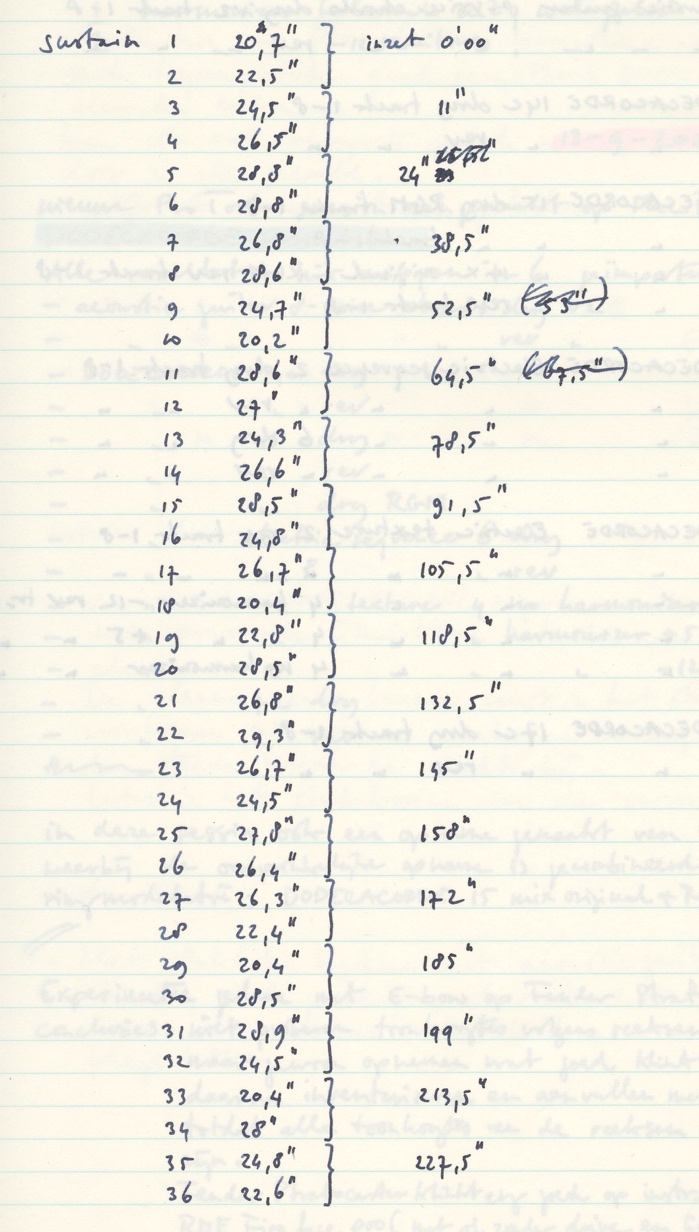 The 36 quadrophonic sound files were distributed over 16 tracks in such a way that every sound file starts at half the duration of the preceding one. In the second and final version of this material group, combinations of two quadrophonic sound files were made before they were placed in an overlapping form of 24 tracks, as a result of which the total duration became considerably shorter.