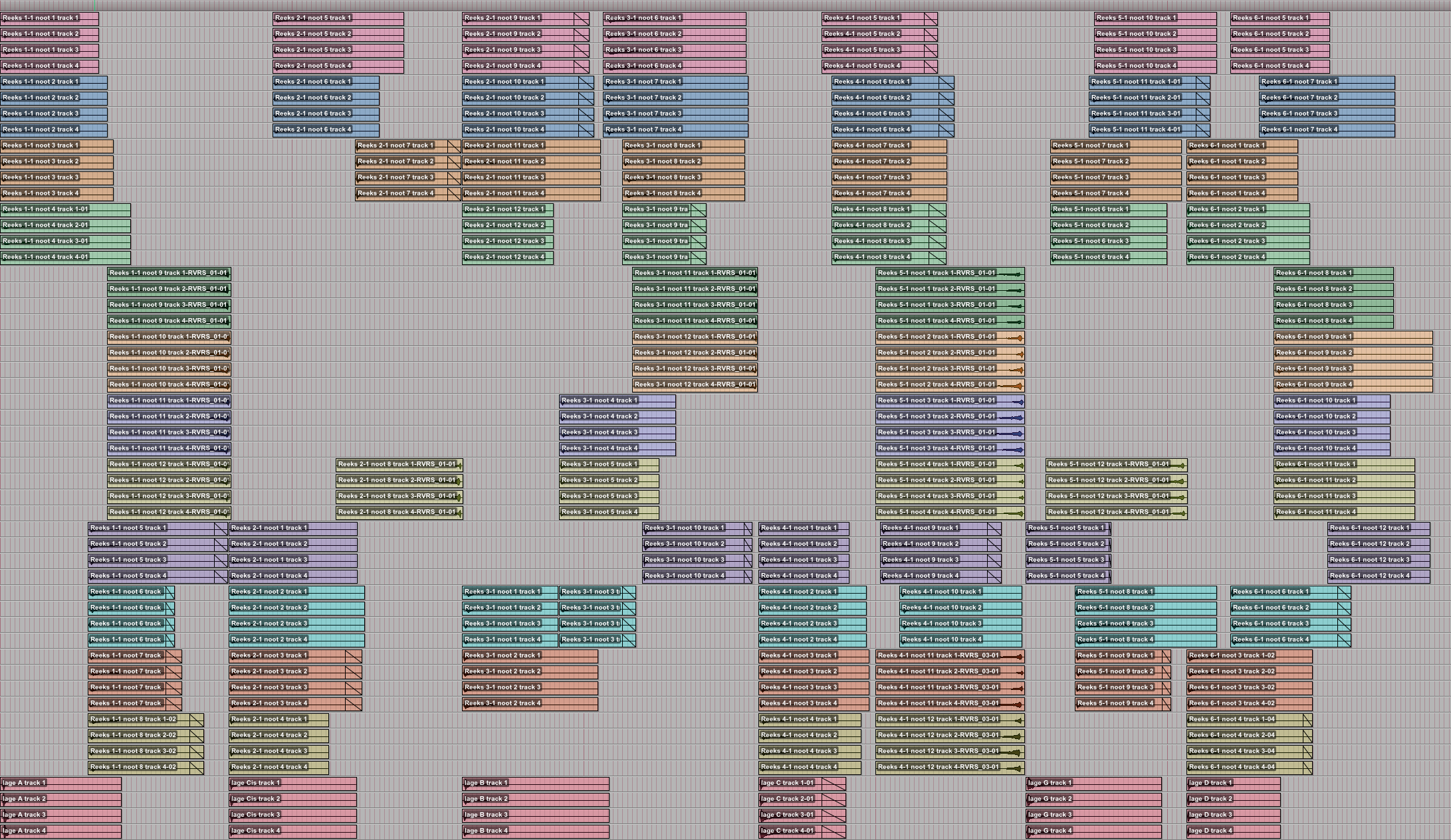 Figure 32: synchronisation of resynthesized e-bow sounds. Each tone is a quadrophonic sound, each group consists of 12 tones and 48 channels.