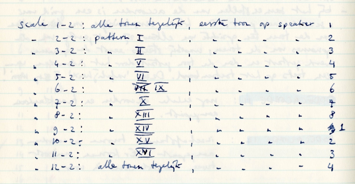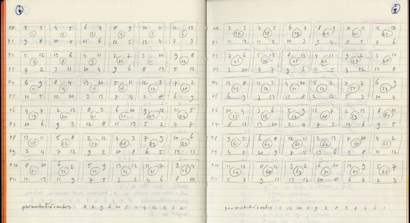 This also explains why tables and matrices are so often used in the descriptions of the production of the material groups for Source Signals 2. These provide the material groups with an underlying structure, which not only ensures cohesion within a material group but also constitutes an investment in the material groups, which pays off as well when (parts of) these groups are combined into larger constellations. The same pitch sequences and numerical constructions underlie these material groups, so that when they (partially) overlap they enter into relationships with each other that are meaningful to me, and, I assume, also to the listener.