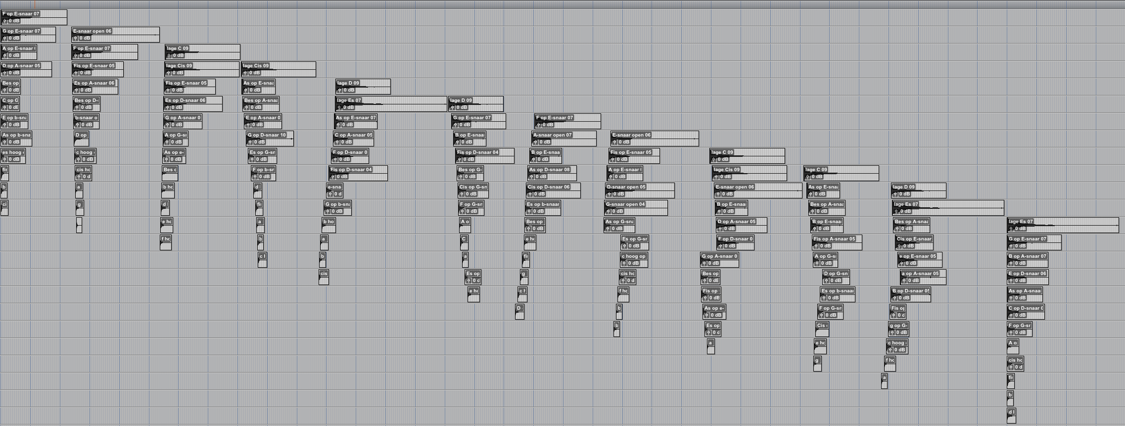 A selection of sustained sounds was made and provided with fade-ins and fade-outs, after which they were placed in a construction of 8 stereo layers, resulting in a continuous wall of sound with varying tone colours.