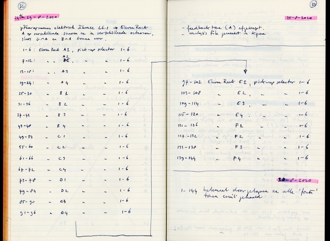 What becomes clear from the list of amplifier/sound-effect combinations shown earlier, is that the distorted guitar sounds appear in E1–F1, whereas A1–D4 are relatively ‘clean’. Eventually it was decided to make 2 groups of 12 sequences, in such a way that the distorted sounds only occur in the second series of 12 sequences.