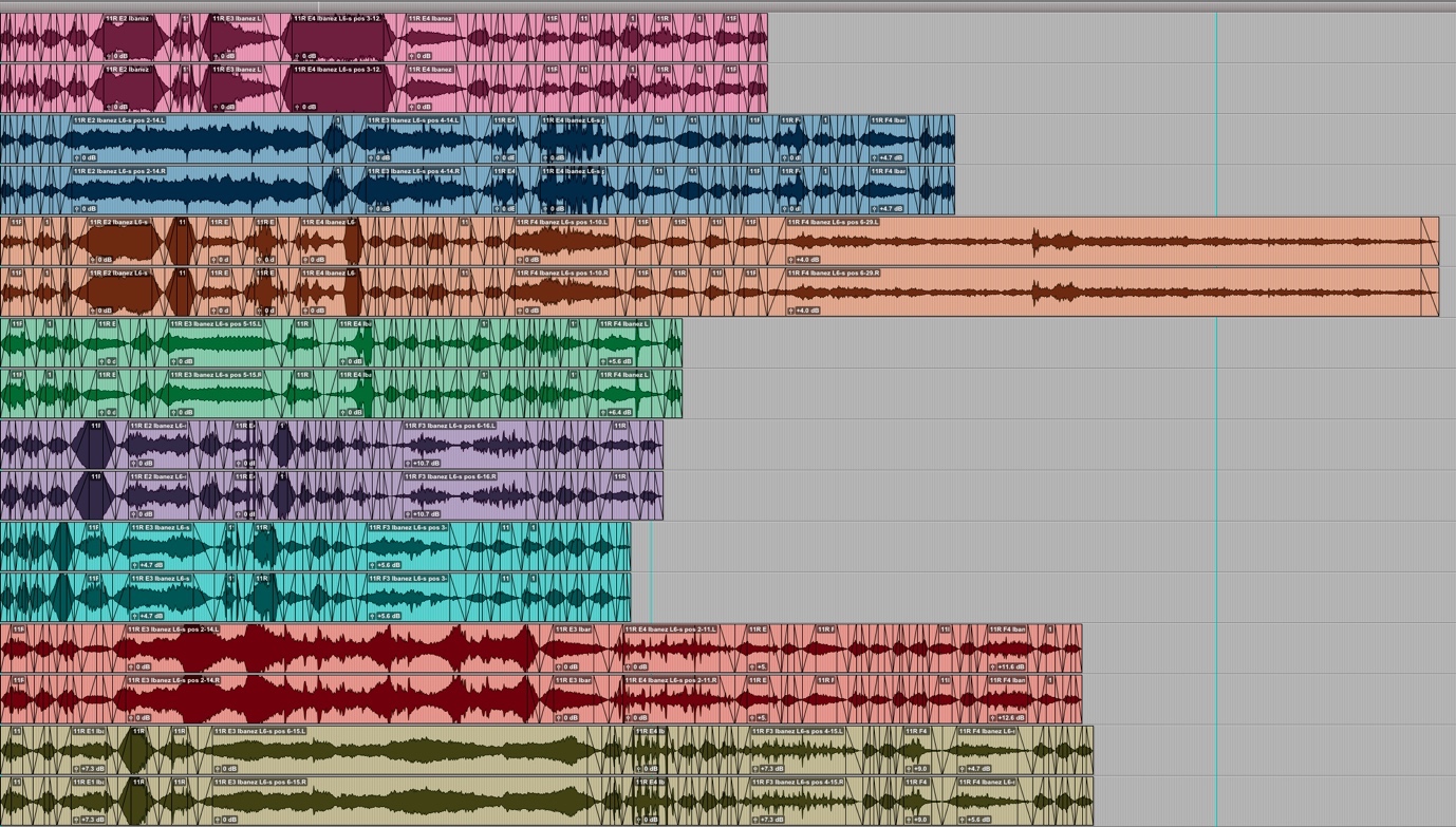 These 9 sounds were mixed to 8 channels and recorded, during which some filtering with the channel-strip plugin was applied again. The 8-channel mixes were then placed in the following order with overlaps and volume envelopes: sounds from the 12th fret, 7th fret, 5th fret, 9th fret, 3rd fret, 15th fret, 17th fret, 2nd fret, and 10th fret.
