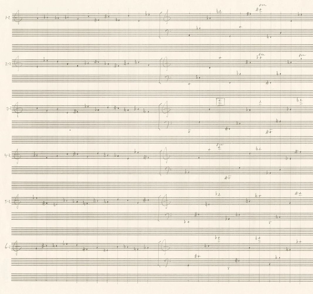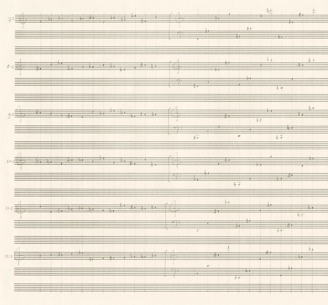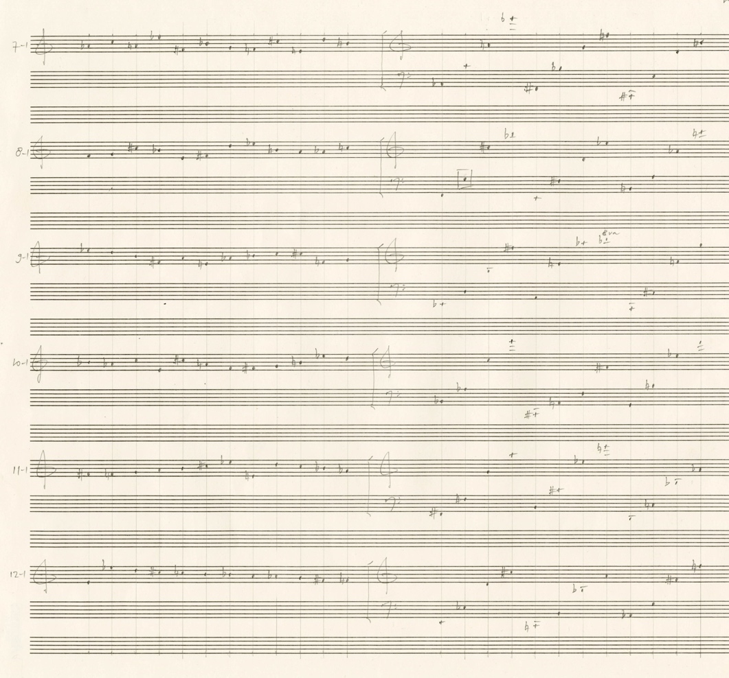 The structure of Material Group 2 consists of single tones and combinations of 2 to 6 tones. In the case of tone combinations, the twelve-tone series progresses vertically.
