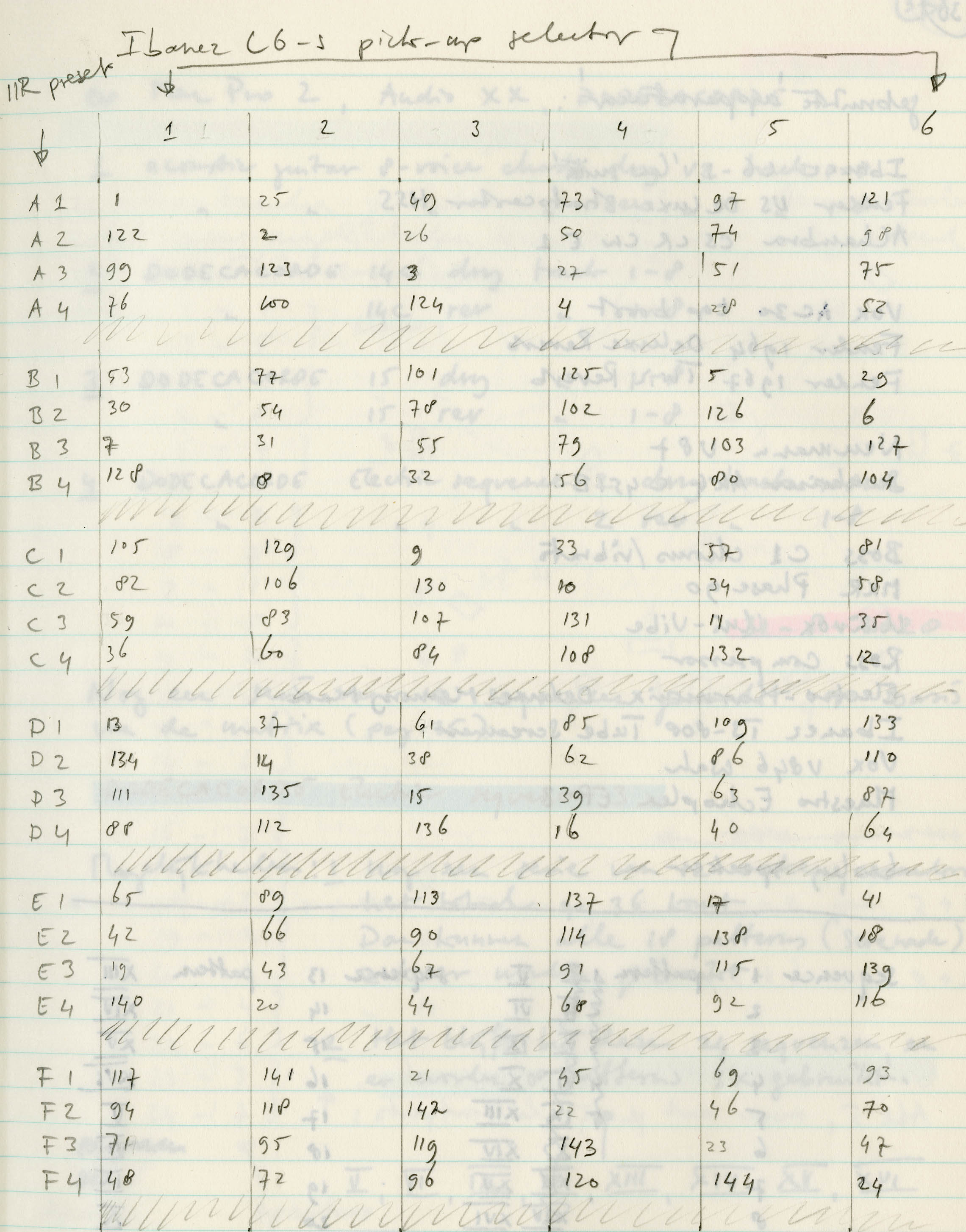 Figure 18: matrix with 144 different electric guitar sounds (6 pickup positions times 24 amplifier/sound-effect combinations). The numbers indicate the order in which they appear in the sequences.