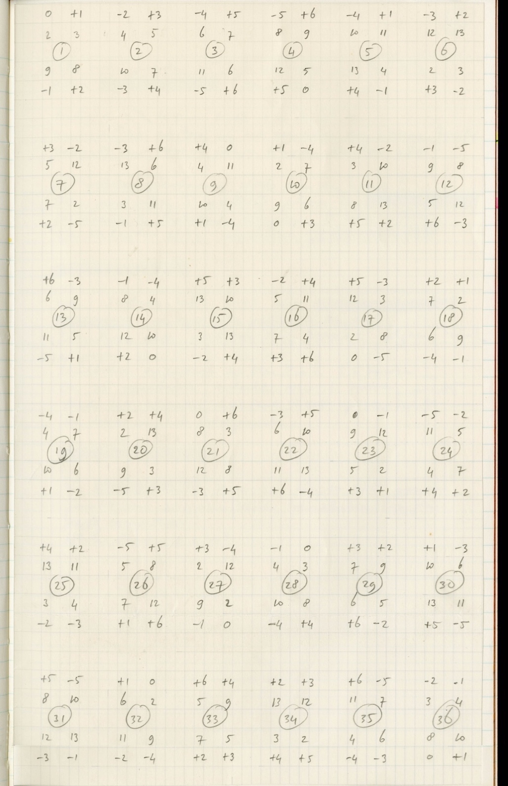 Figure 22: table with 36 presets for a quadrophonic Kyma resynthesis patch. Around the preset number (in a circle) there are four durations and four transpositions, one pair for each output. The pitches follow twelve-tone series 1-2 to 12-2.