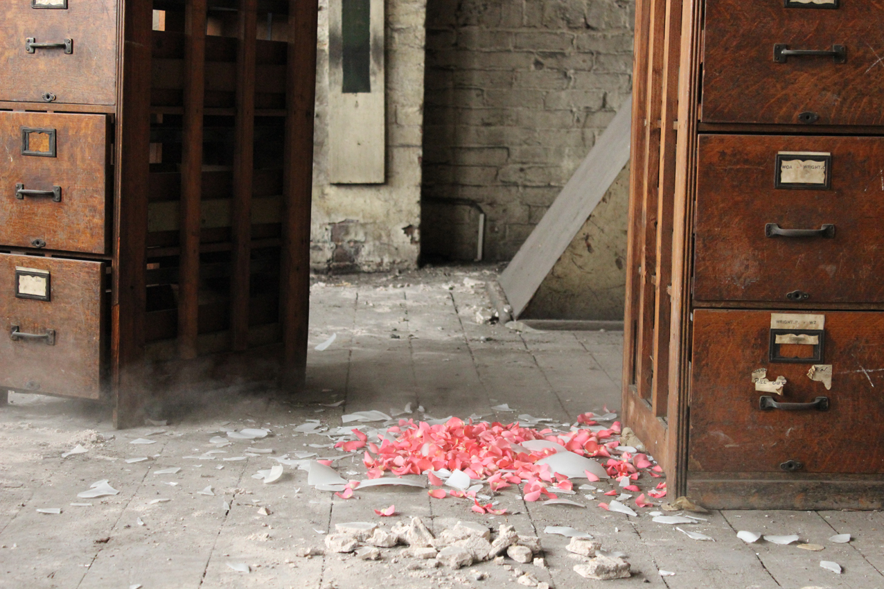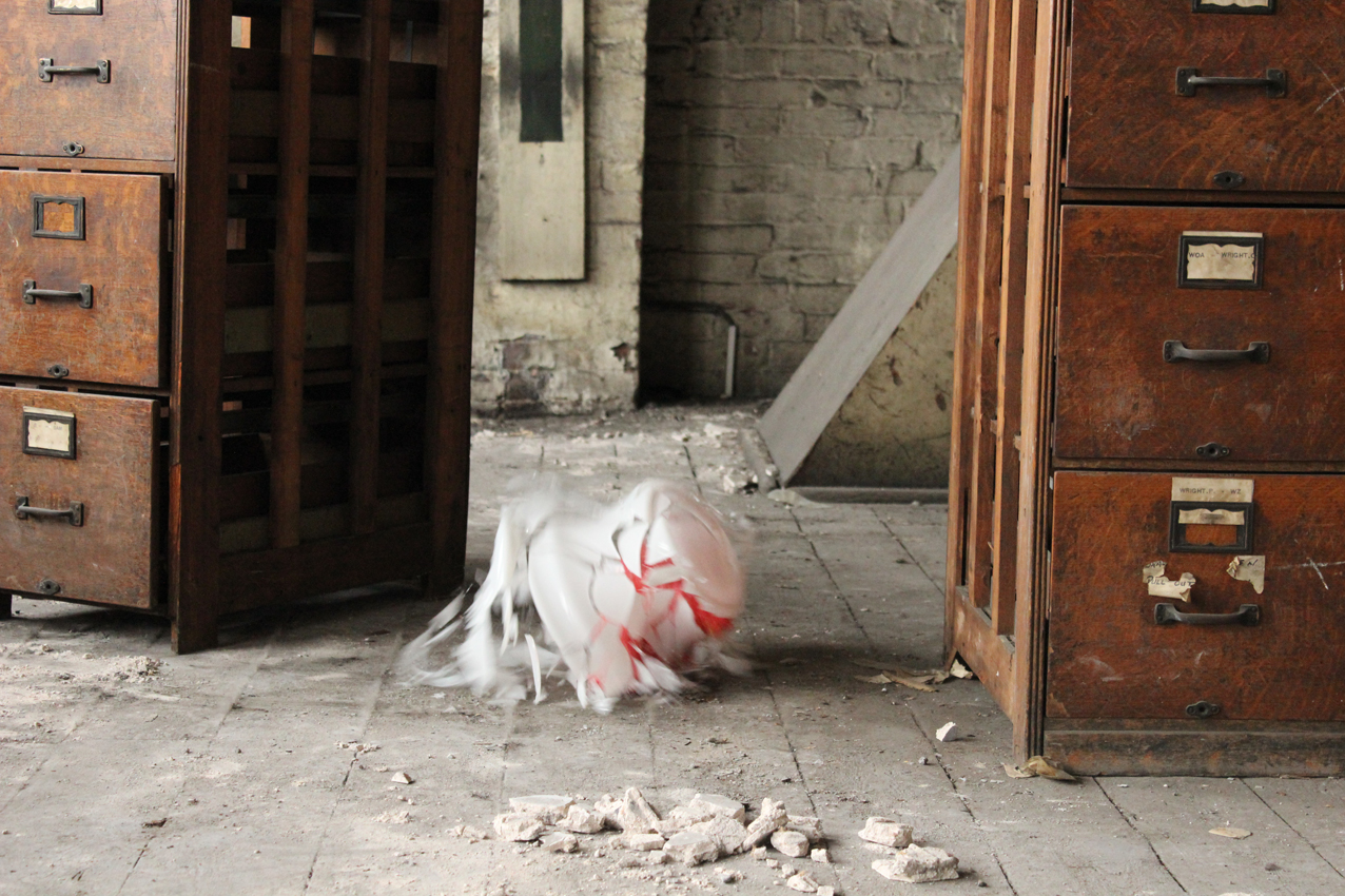 Their performance works for camera in the chapters Holding On By Letting Go and On Passing mine the histories of Spode through silted memories and artefacts contained within crumbling walls and leaking roofs. Through a series of gestures in which fragile items are passed between them until inevitable slippage takes place, the artists create a further layer in the production of contemporary shards. In doing so they are seeking to re/generate new and living histories in spaces that resist expiring. They are unreliable archaeologists introducing empathy and contamination to the sites they inhabit.