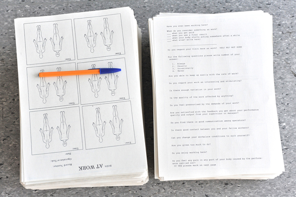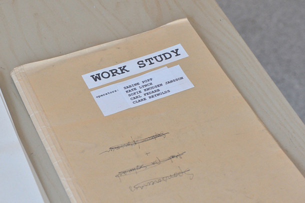 The involved artists met through the artistic research projectTopographies of the Obsolete. Elements of the dialogue on Work Study are transferred from the Spode factory site in England to the laboratory like situation of ROM8 in Bergen. Recording systems and notations from working processes formed the starting point for examining and acting out the absurdity of lost production and working community on site. The artists were dialogue partners in several periods throughout 2013 in Stoke-on-Trent, and bring together elements which individually have developed since for a continuing discourse.