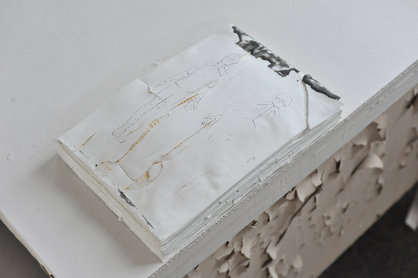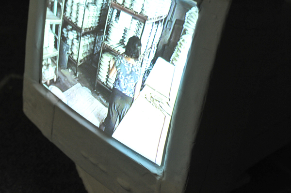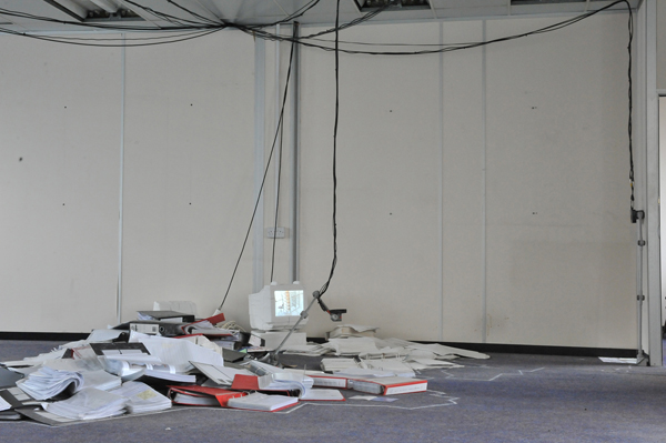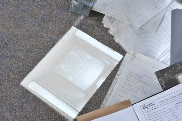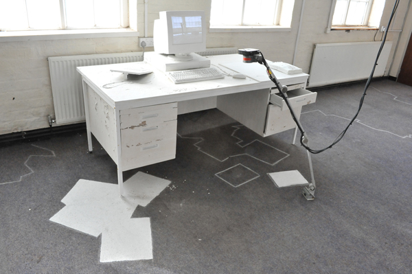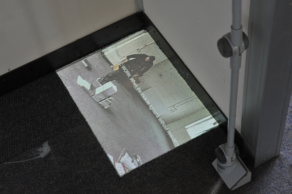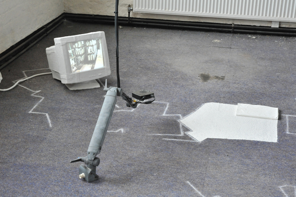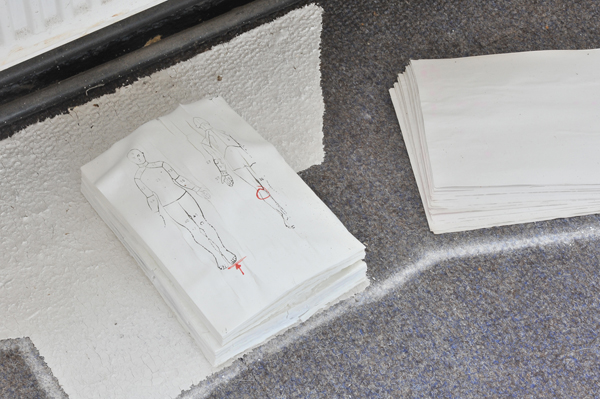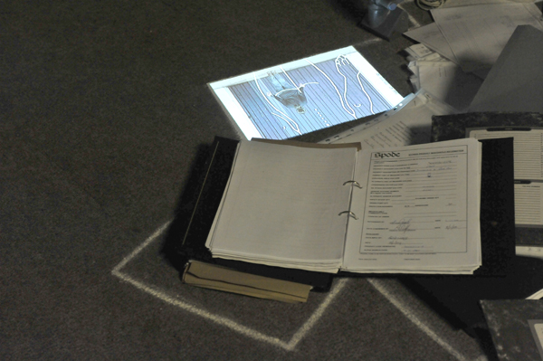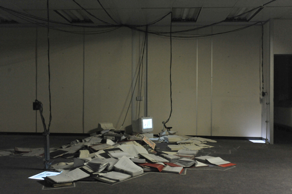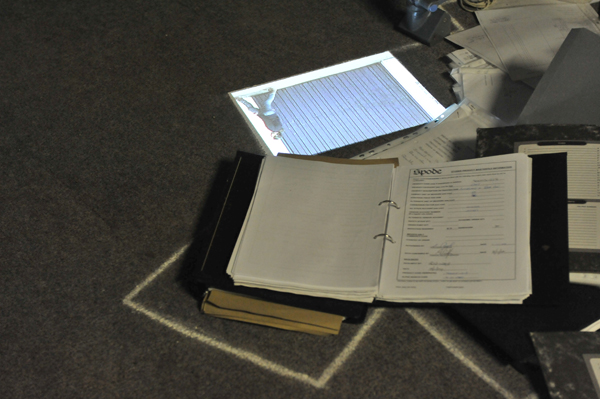 The work started out from the idea of efficiancy of action and movement related to production. Archives of schemes for following up, exercising and renewing working processes were found spread over the floor of an office space. The work study system was turned hollow and absurd with the ending of production. The project aimes at examining and acting out this absurdity.