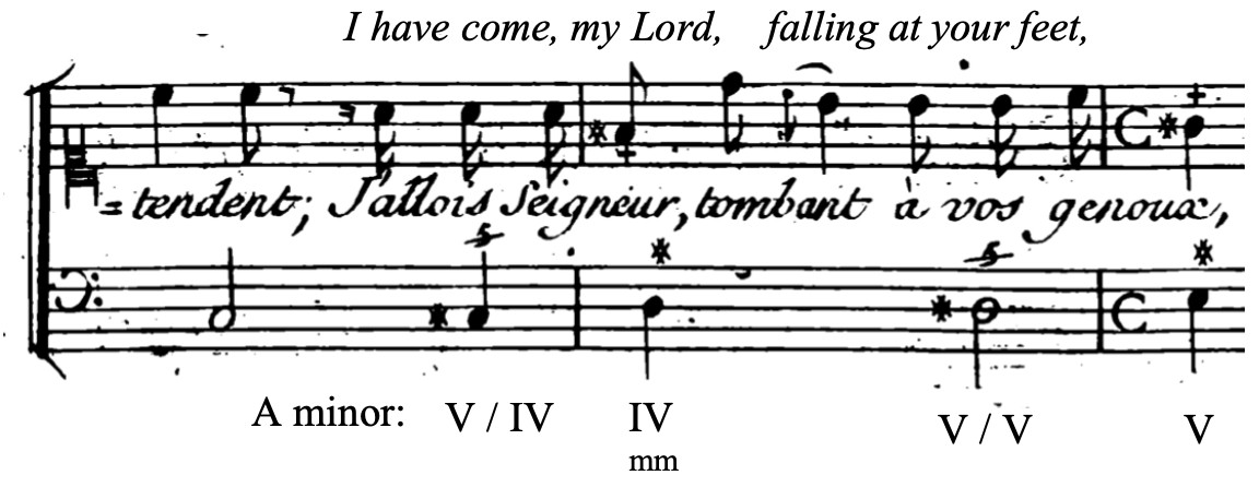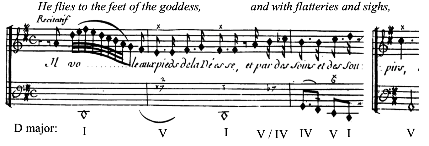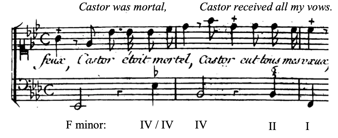 In Rameau’s case, V/IV chords tend to appear when a character is expressing pain or making a supplicating plea. For instance, Rameau makes use of one when Télaïre begs Pollux to go to Hell and bring Castor back, saying “J’allais, Seigneur, tombant à vos genoux.” Rameau makes the effect even more powerful by replacing the expected minor IV (in a minor mode) with a major IV, filling the word “Seigneur” with light. The bass line also follows an ascending chromatic line, imitating a physical gesture of supplication.