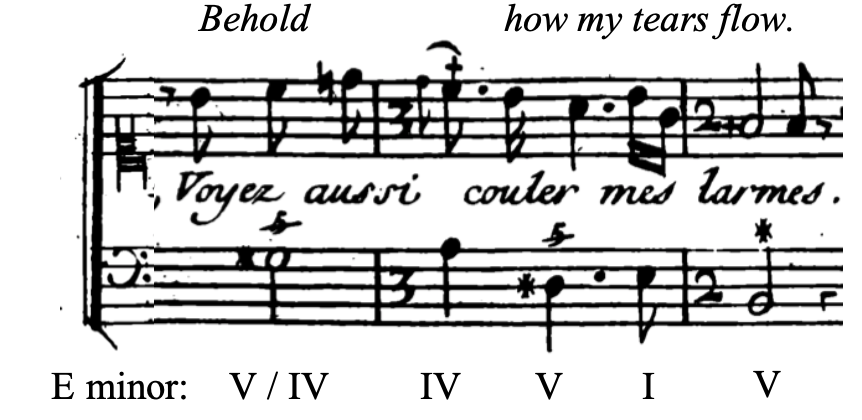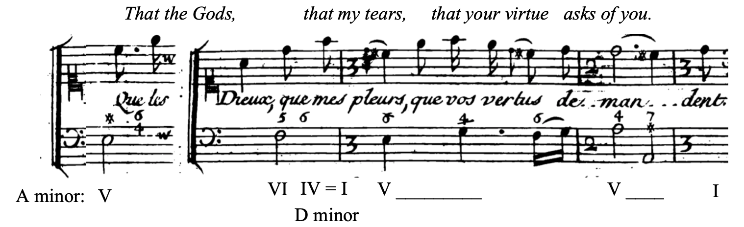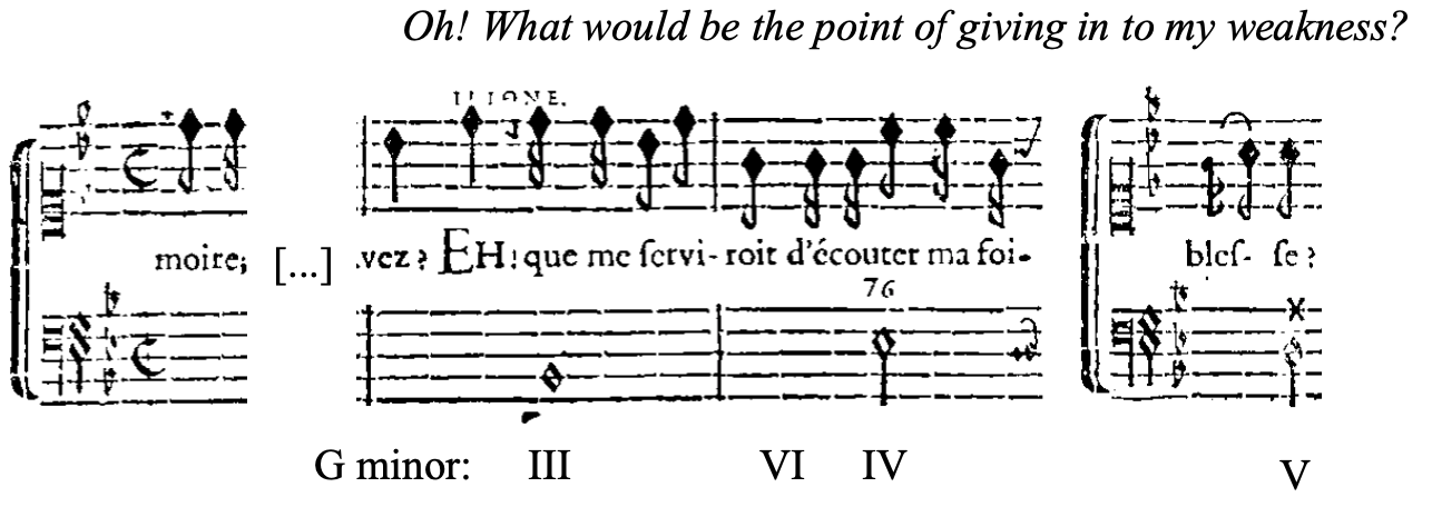 Later, it is Phébé’s turn to implore Pollux with the exact opposite plea: to forgo sacrificing his own life for his brother’s and instead stay, for her sake. Again, the V/IV appears when Phébé refers to her own supplication, saying “Voyez aussi couler mes larmes.” Again, the bass melody is evocative: it first goes up a half step, then falls to repeat the same pattern, suggesting the very sobs Phébé is referring to.