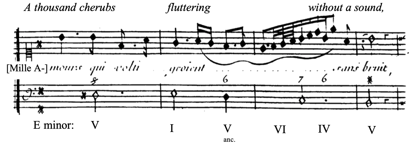 It is important to note, however, that although a question is almost always associated with a half-cadence, the opposite is not true; a half-cadence can very well appear when no question is being posed. This is the case in Clérambault’s cantatas analyzed here. Indeed, Clérambault uses phrygian half cadences when the text describes sweet and frail things, such as when a thousand cherubs fluttered silently about Apollo. The image is strengthened by the brief melismatic passage in the voice, illustrating the flight of the little gods.