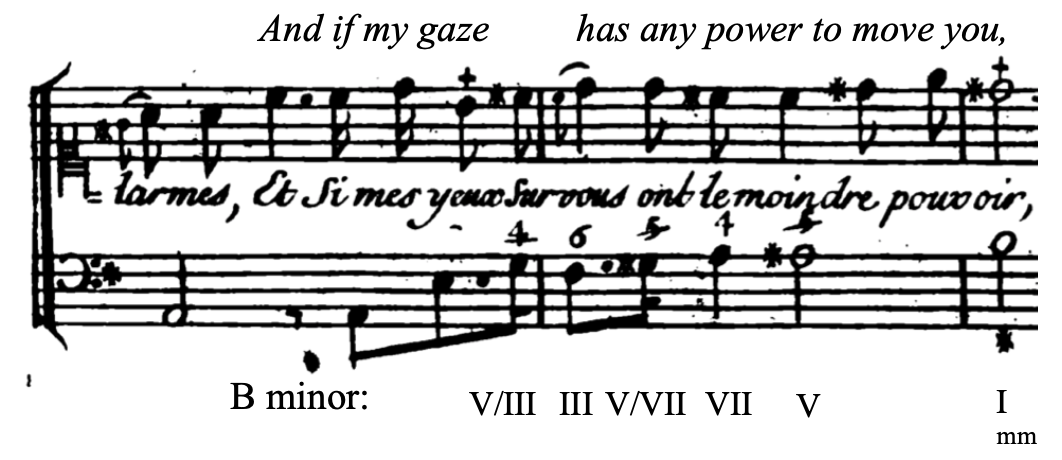 In Rameau’s case, borrowed dominants, much like the V/IV, are used in cases of supplication. He uses them to create an ascending line in the bass, again imitating a pleading gesture. When Phébé pleads with Pollux not to sacrifice his life for his brother’s, she tells him that if her eyes have any power over him, he should be moved by her tears. Her words are accompanied by a chromatic ascending bass line, which Rameau creates by using first a V/III, then a V/VII.