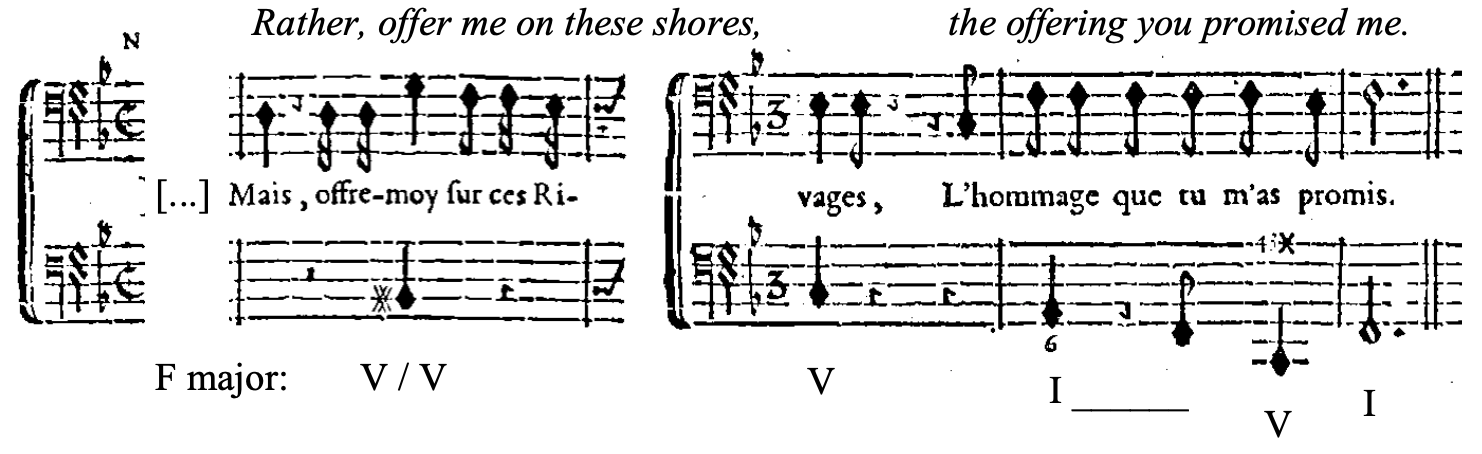 Any link between harmony and text found within the V/V category is tenuous at best, as there does not appear to be a text-to-harmony correlation common to all four composers. Campra’s use of the chord, however, is promising; in the examples found in this study, he associates this secondary dominant to words of glory and sacrifice. For example, he uses a V/V when Neptune commands Idoménée to offer him the sacrifice he promised in exchange for his life. Here, the V/V chord is all the more striking for being used in its first inversion, placing the raised fourth degree in the bass just as Neptune says the word “mais” - “but.” The surprising B natural efficiently highlights the sharp turn in the conversation.