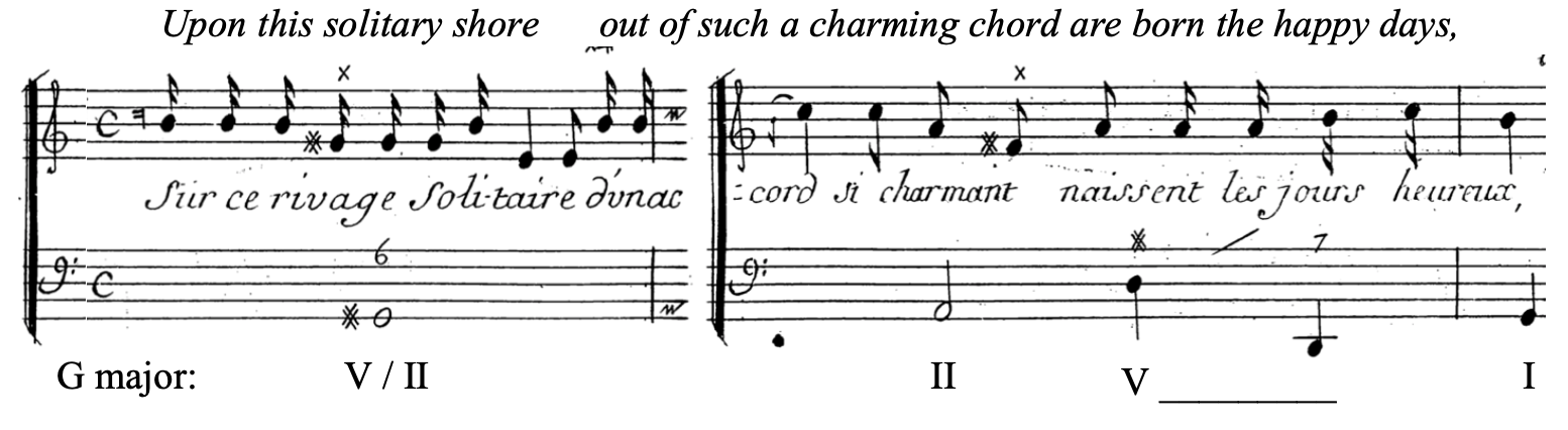 For Jacquet de la Guerre, borrowed dominants occur in descriptions of pleasure—this is evidenced by the fact that, within the works analyzed here, only the cantata “L’Isle de Délos,” which describes an island where everything is devoted to pleasure, contains such chords. A striking usage of a V/II chord occurs in the second recitative of this cantata, where the singer describes the sweet music that can be heard on the banks of the quiet stream. The chord lasts a whole measure and is used in its first inversion, resting on a G# in the bass which contrasts pleasingly with the tonic G that appears two measures later.