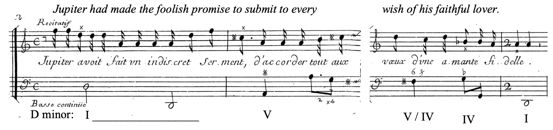 For example, Jacquet de la Guerre includes a plagal movement in “Sémélé” when the narrator explains that Jupiter has made the solemn vow to yield to all the wishes of his faithful lover—the tell-tale descending fourth in the bass falls exactly on the words “amante fidele.”