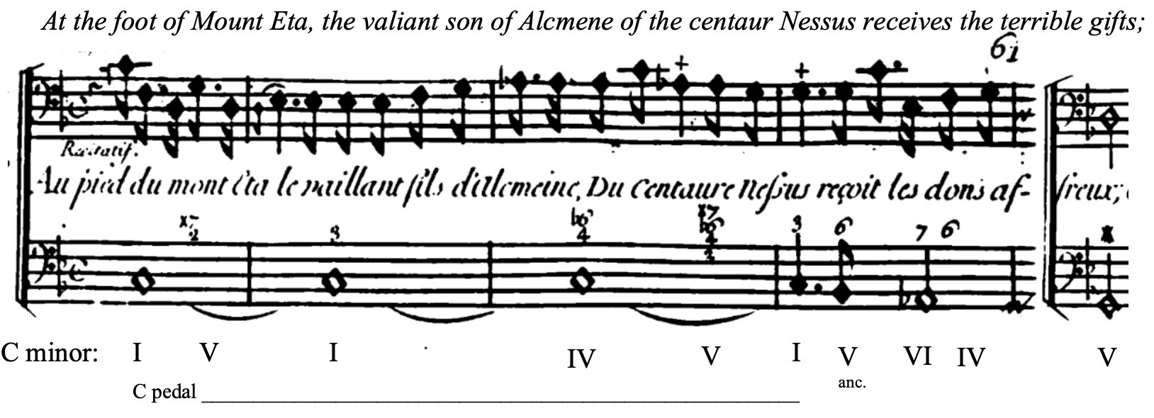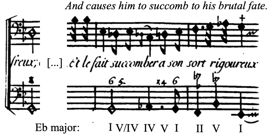 A similar example happens in the same recitative, almost immediately after. The narrator describes how Nessus’ poison enters Hercules’ veins, making him perish to his fate. A V/IV accompanies the words “succomber à son sort.”