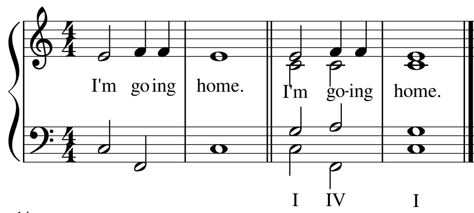 The melody is now harmonized with a plagal cadence. The experience for the listener may now be different: the return home may be understood as a relief or perhaps a sacred duty. As the plagal cadence is often used at the end of pieces and after a perfect cadence, it may suggest to the listener that going home is the much-awaited end of a long journey. A final example: