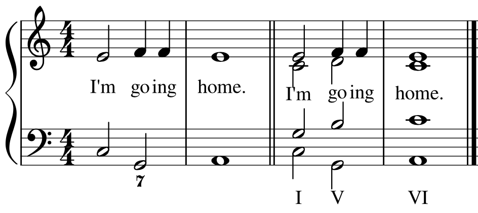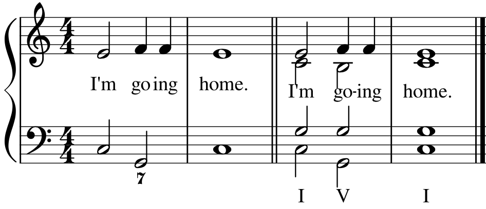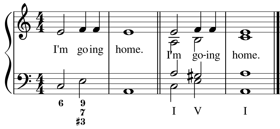 The figured bass here indicates a basic I-V-I cadence. Alone, the words do not reveal much about the emotional resonance of this statement. Why is the speaker going home? Is home a source of comfort, or of tension and distress? Is the journey home the beginning of a story or the ending of one? The perfect cadence may lend the statement finality, but the answer to any of these questions is not clear. A new figured bass changes this entirely: