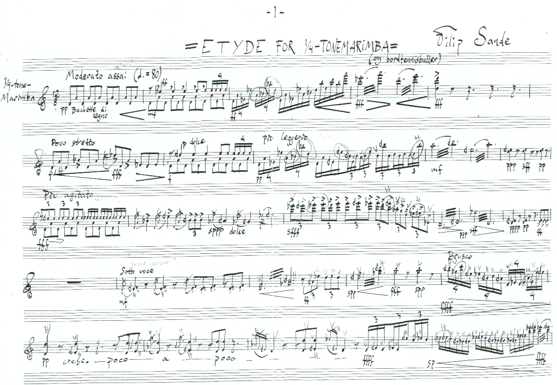 Sande only used the 3 row of the quartertone marimba ("the quartertone flattend white keys"), and only the quartertone down symbol.