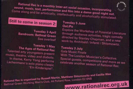 The concert was located at the "Working men's club" in Bethnal green, East London. A really old, dirty, smelly Pub ca 400 m2. The cover charge was set to 5. I was located on stage beside the screen were we projected the images, and the rest of the musician where on the floor. People sat by tables and some stood at the bar. The audience arrived at 8 and bought bear and talked. All together it was 120 people on this event.
