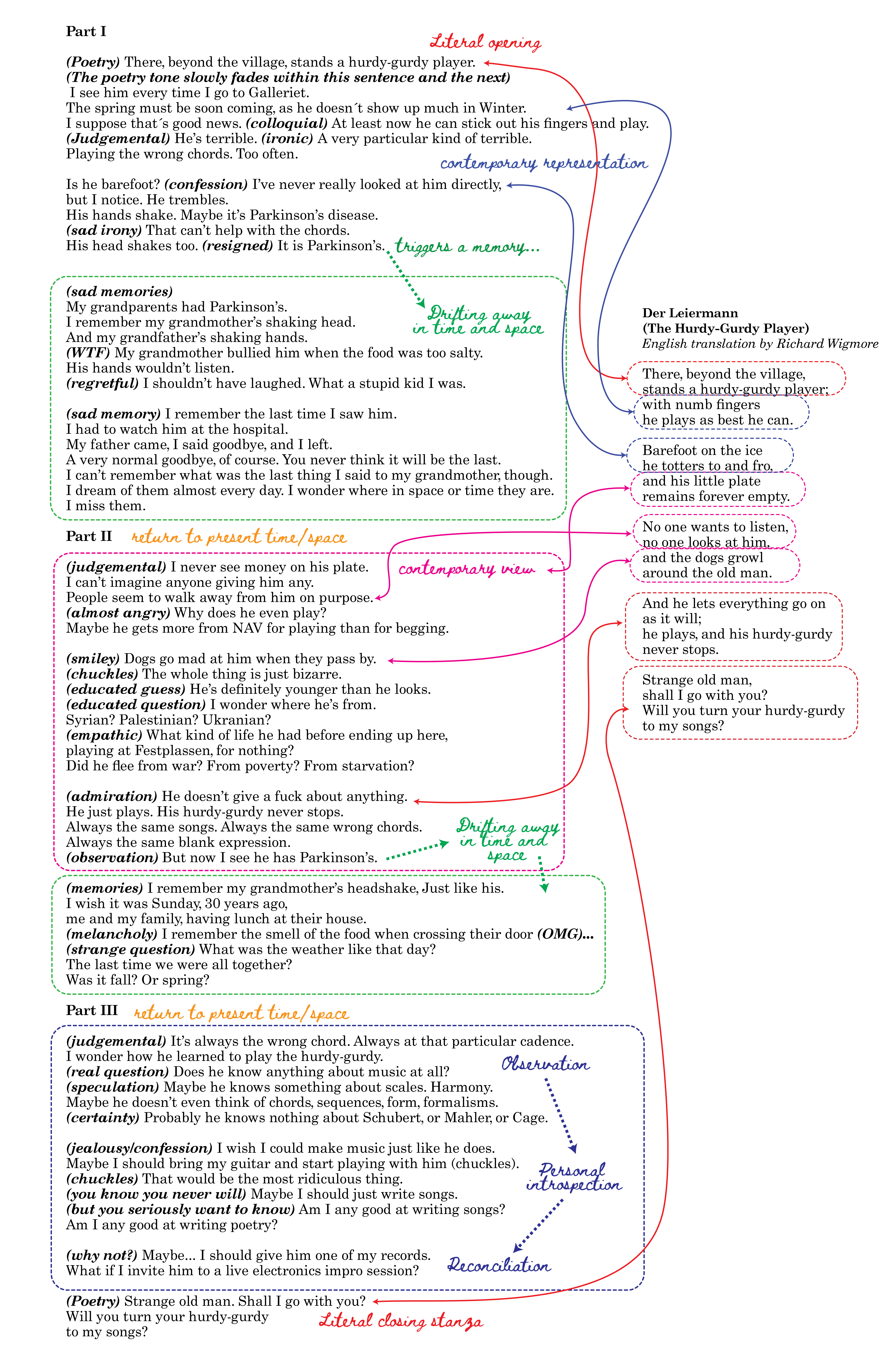 At the same time, this narrated part reframes the idea of prompting –somewhat connected to its musical use explained above, but this time as a metaphor for a mental drift triggered by the verses of the poem “Der Leiermann.” In this sense, this type of oscillating mental state –which is commonplace along the full cycle– here has been used not just as a compositional resource, but also as a literary mode: the original verses appear at the beginning and at the end of the narration, pronounced with a poetic narrative voice. Subsequently and over the three sections of the piece, a slow process of drifting takes place. Initially, the tone becomes totally intimate and personal, and the narrative shifts in time and space through memory evocations, yet some of the verses still evoke the original verses of the original poem. In the image below can be observed the narrated part and how it relates to “Der Leiermann.” The bold italics are indications of character for the narrator.